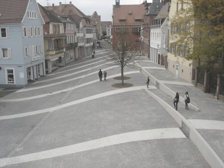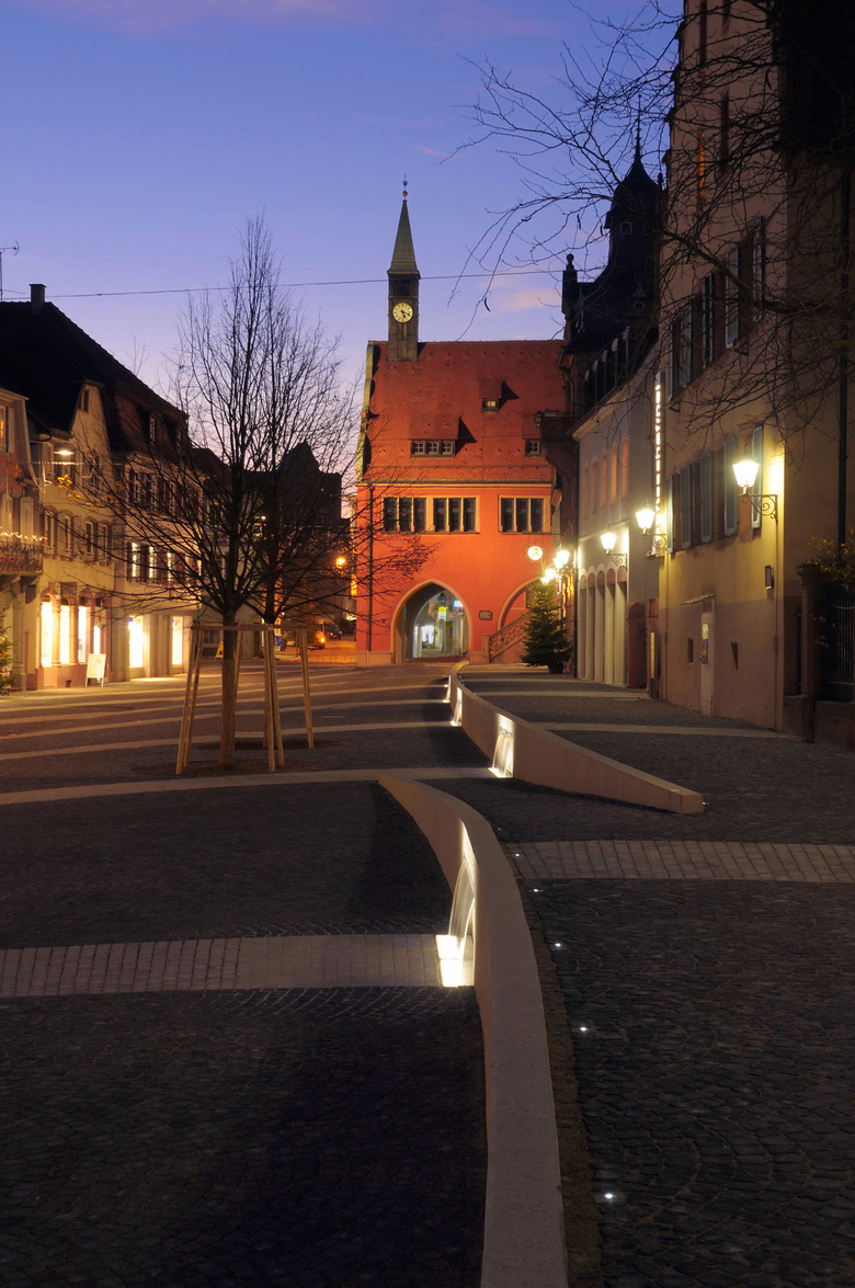 Wenn das Meer sich zurückzieht, hinterlässt es Spuren im Sand. An dieses Muster erinnert die Gestaltung des Urteilplatzes in Lahr. Edler Naturstein wurde verlegt, Bäume gepflanzt und leuchtende Brunnenelemente integriert. Der fertig gestellte Platz gleicht einem Ballsaal. Er verbindet die mittelalterlichen und modernen Bauten im Stadtkern zu einem traditionellen, festlichen und geräumigen Zentrum.