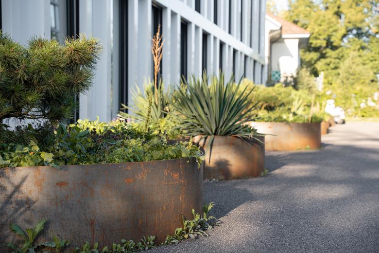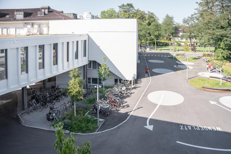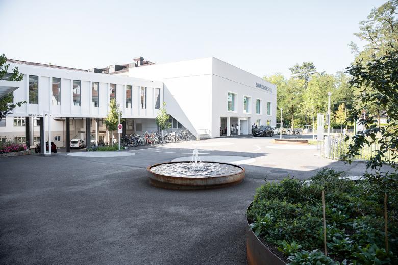 Durch den Ausbau des Nordtrakts und den Neubau eines Verbindungsgangs zwischen West- und Osttrakts wurde die Umgebungsgestaltung für die heutigen Ansprüche und Bedürfnisse neu konzipiert. Die offen gestaltete und barrierefreie Hoffläche wirkt als Teppich im Raum und somit als vereinendes Grundelement in der Umgebungsgestaltung. Die konzeptionelle Anwendung der einfachen Kreisform, lässt die sonst zweidimensionalen Fläche in einen dreidimensionalen und facettenreichen Raum werden. Durch geschickte Platzierung von unterschiedlich grossen Pflanzinseln wird eine Spannung im Hof erzeugt, welcher räumliche Akzente setzt. Ferner wird die Atmosphäre des Hofes mit dem plätschernden Ton des Wasserspiels erweitert. Ein dezenter und klarer Schnitt wird zur Umgebung des Altbaus gesetzt, um ihn in seiner Präsenz und Schutzwürdigkeit zu stärken. Der Übergang wird aber offengehalten, um den grünen, parkartigen Aussenraum auf den Platzsituation fliessen zu lassen. Neu wird der Personalparkplatz von Osten her erschlossen und mit zusätzlichen Veloabstellflächen erweitert. Die Arbeiten wurden unter laufendem Betrieb realisiert.