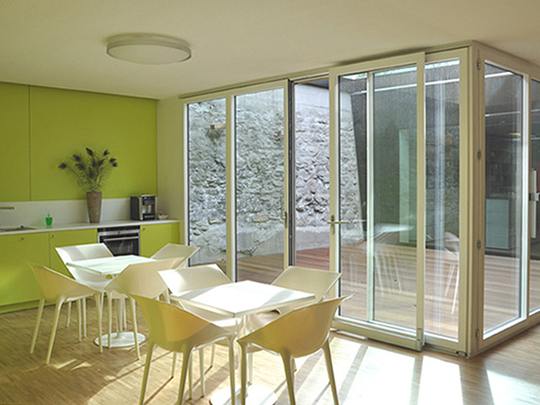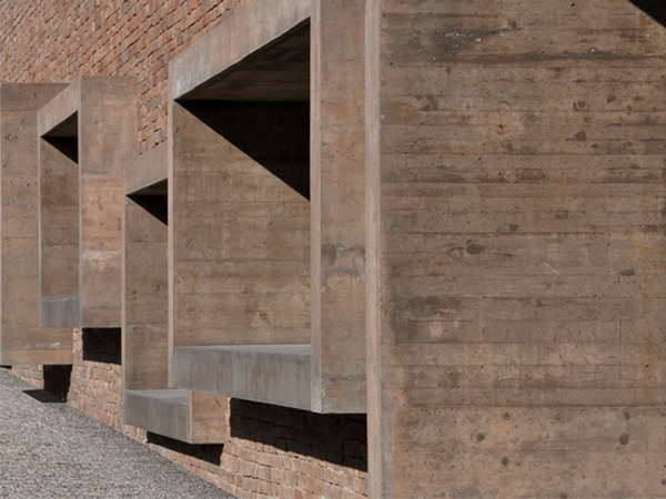 Des patios et éclairages zénithaux rythment l'accès de la lumière au niveau des bureaux et des circulations intérieures. Les façades sont revêtues de pierre et les ouvertures sont disposées de façon irrégulière pour accentuer la force du socle.