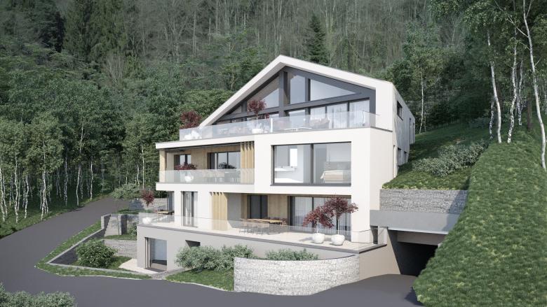 Die vier Wohneinheiten bespielen die unterschiedlichen Ebenen aufgrund der Hanglage und integrieren sich sanft in die Umgebung.