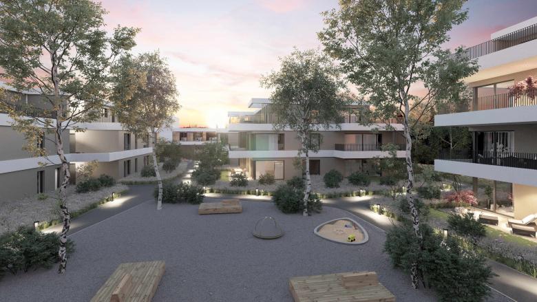 Die beiden grünen Freiräume sind die Hauptdarsteller und um sie dreht sich alles. Die Häuser orientieren sich in der Lage und Ausrichtung an ihnen und schaffen einen spannenden Dialog. In der ersten Etappe werden die Häuser 1 und 2 mit Eigentumswohnungen und das Haus 3 mit Alters- und Pflegebereich realisiert.