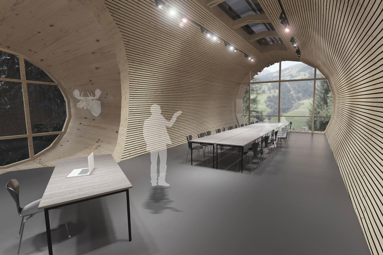 Die Gestaltung des Waldzimmers beruht auf der Identifikation zum Wald. Der gefällte Baum, bildet das Zuhause des Waldzimmers. Nur die Schnittflächen der Baumstammenden und der abgetrennten Äste, bieten Einblick in das Innere. Der Baumstamm liegt auf dem unberührten Waldboden, bereit zum Abtransport. Rückseitig liegt der Stamm leicht in den Waldboden eingesunken.