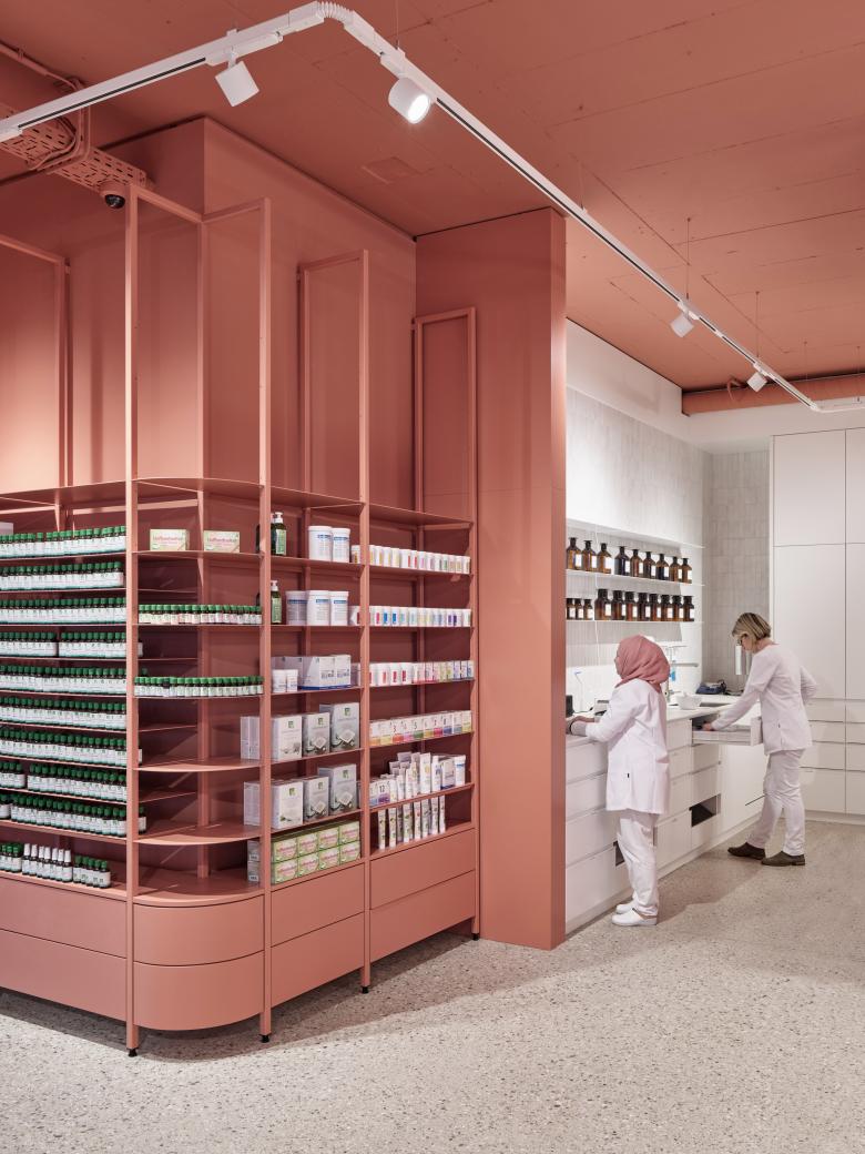 Drei monolithische, ebenfalls in Rosa geflieste Doppel-Tara-Plätze geben den Blick auf die großzügige Sichtwahl frei. Dahinter liegen der Lagerautomat und das Back-Office. Kurze und schnelle Wege auch hier. Im architektonischen Seitenstrang finden der diskrete Beratungsraum, das Chefbüro und das Labor Platz. Von dort gelangt man ins Handlager, den Raum für Mitarbeiter:innen und ins Nachtdienstzimmer.