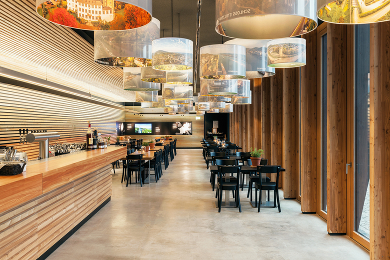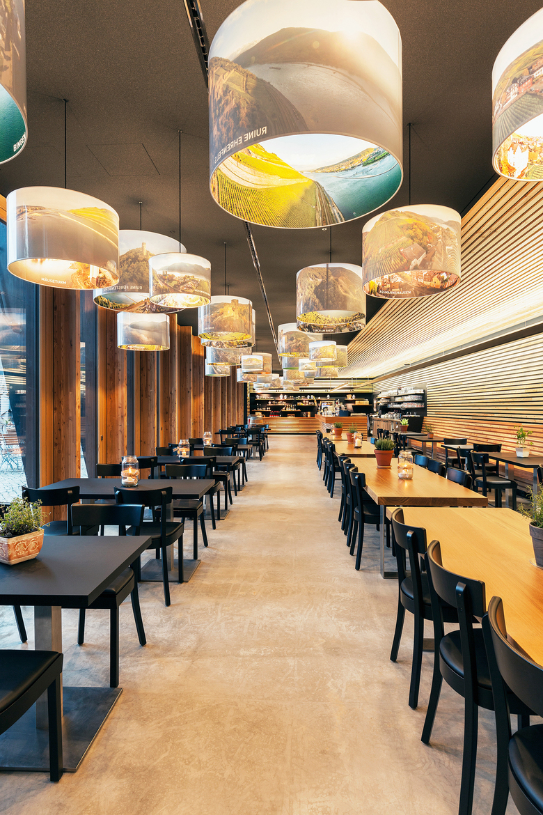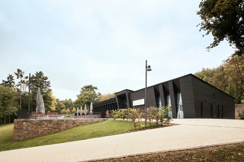 Das Besucherinformationszentrum liegt zwischen Seilbahnstation und Niederwalddenkmal am Eingang zum Ostein'schen Park oberhalb von Rüdesheim am Rhein. Das langgestreckte Haus liegt unterhalb der Zufahrt zum Parkplatz und fügt sich dank der dunkelgrauen Holzfassade mit den großen Fenstern in die Umgebung. Zur Terrasse wird die Fassade durch den Wechsel von raumhohen Fensterelementen und prägnanten Holzschotten gegliedert. Durch das Kippen der Fassade zur Talseite und dem zur Rückseite abfallenden Pultdach wirkt das Haus sehr dynamisch. Vor dem Haus liegt über die gesamte Breite die große Außenterrasse. Über diesen Platz verläuft der Weg der Besucher von der Seilbahnstation hin zum Niederwalddenkmal. Schon im Vorbeigehen können sie sich auf haushohen Informationstafeln über den Ort informieren. Den Zugang zum Haus wird von einem großen Rahmen definiert, der deutlich über die Kubatur ragt. Von hier gelangt man in den großen Multifunktionsraum mit Ausstellung und Restaurant. Der Gastraum wird von warmen Holztönen im Kontrast zu der dunklen Wandverkleidung und dem roh versiegelten Betonfußboden bestimmt. Eine Lampenlandschaft mit Motiven des Landschaftsparks sowie eine lange Theke sind die zentralen Elemente. Raumhohe Fenster ermöglichen den Blick über die Terrasse auf das Rheintal und weiter bis zum Odenwald zu. Im Bereich des Cafés können die Fenster vollständig geöffnet werden und ermöglichen so einen fließenden Übergang vom Gastraum auf die Terrasse. Im rückwärtigen Bereich sind Küche, Kühlräume, Umkleiden für die Mitarbeiter und die WC-Anlagen untergebracht. Bei der Planung des Hauses wurde viel Wert auf die Einbettung des Neubaus in seine Umgebung gelegt. Mit einfachen gestalterischen Mitteln wurde dabei eine Architektur entwickelt, die dem Ort einerseits und der Funktion des Hauses andererseits Rechnung trägt.