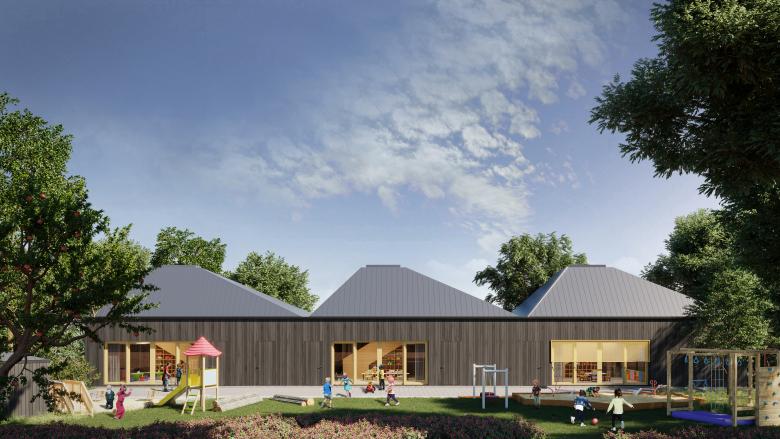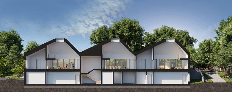 Der Entwurf sieht einen zweigeschossigen Baukörper vor, der sich in drei gleich breite Gebäudeteile mit jeweils einem eigenständigen Dach gliedert. Wegen der starken Topografie des Grundstücks wird der Baukörper in den Hang geschoben. Man betritt das Gebäude auf der Ostseite im Erdgeschoss über ein Foyer. Im EG orientieren sich die Krippengruppe mit Schlafraum, ein Mehrzweckraum und das Büro der Kitaleitung zum Garten. Hangseitig sind die dienenden Räume sowie Räume für Personal und die Küche mit Lager angelegt. Über das Treppenhaus mit Aufzug wird das Obergeschoss erschlossen. Hier orientieren sich die Elementargruppen und die Mischgruppe zur Westseite, während die Individualräume und der Personal- und Besprechungsbereich mit Teeküche auf der Ostseite des Gebäudes liegen. Die Gruppenräume im Obergeschoss orientieren sich mit großen Fenstern zum Garten. Der eingefriedete Spielgarten der Kindertagesstätte entsteht größtenteils auf dem benachbarten Grundstück und wird mit verschiedenen Spielpunkten für die unterschiedlichen Altersklassen ausgestattet. Die Spielbereiche für Ü3- und U3-Gruppen sind offen gestaltet.