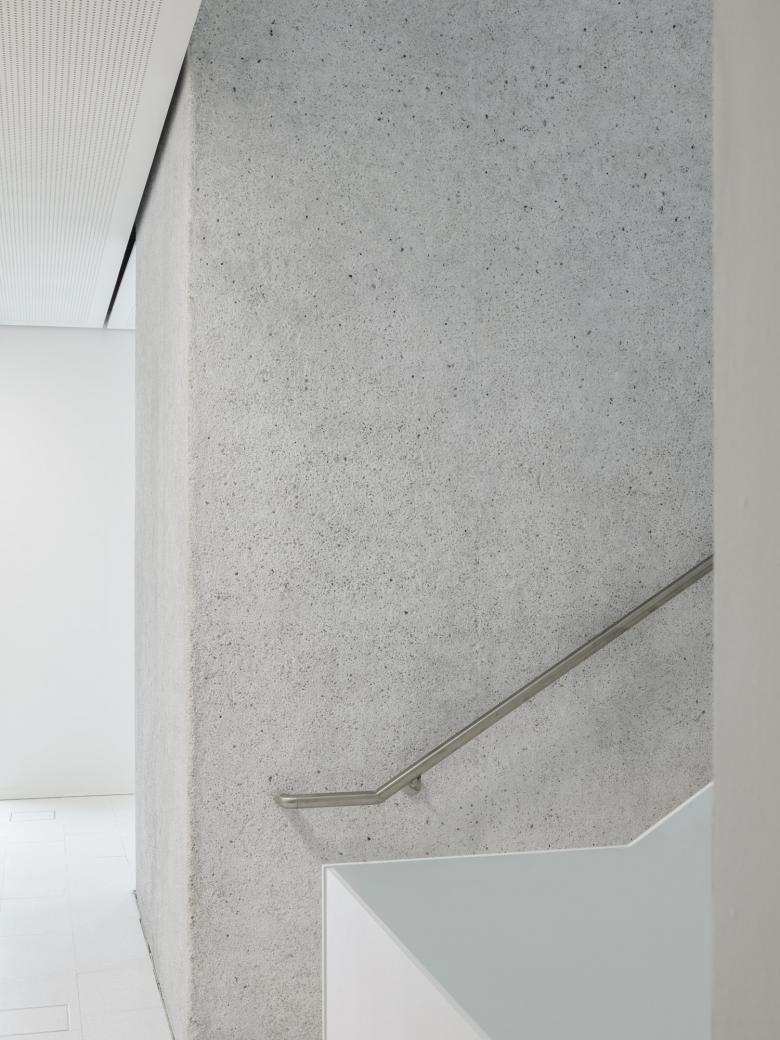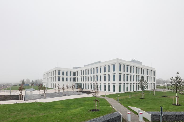 Der Neubau des NAU Administrative Building liegt auf dem Gelände der Clay Kaserne bei Wiesbaden. Der durchgängig dreigeschossige Baukörper wird aus zwei versetzt angeordneten Volumen gleicher Größe gebildet. Der Versatz gliedert die Baumasse und lässt zur Straße eine Vorplatzsituation mit klarer Adressbildung entstehen. Eine Fassade aus vorgehängten, gestrahlten Betonfertigteilen verleiht dem Gebäude seine unverwechselbare Gestalt. In die Volumen eingeschnittene Patio-Höfe strukturieren die Baumasse und schaffen introvertierte und begrünte Außenflächen. Deren glatte und ruhige Aluminium-Fassade lenkt den Fokus auf die begrünten Außenbereiche. Die Innenräume und Einbauten folgen einem durchgängigen Farbkonzept in hellen, monochromen Tönen. Die Fahrstuhlkerne wurden aus in weißem gestockten Sichtbeton hergestellt.