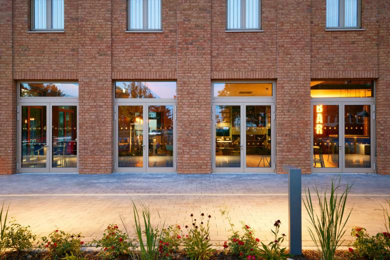 Die Lobby des Hotels ist sowohl vom Gustav-Stresemann-Ring als auch vom rückwärtig anschließenden Parkdeck aus zu erreichen. Hier liegen zentral die Rezeption mit Bar und Lounge, das Restaurant und die Erschließung. Die insgesamt 164 Zimmer orientieren sich zum Ring oder zum rückwärtigen Grundstück. Es sind drei verschiedene Zimmertypen vorgesehen. Im Untergeschoss sind Nebenräume und die Haustechnik untergebracht. Das Parkdeck mit 66 Stellplätzen ist auf zwei Ebenen von der Mainzer Straße und von der rückwärtig liegenden Fritz-Reuter-Straße zu befahren.