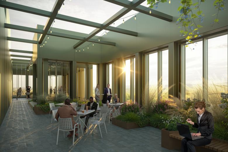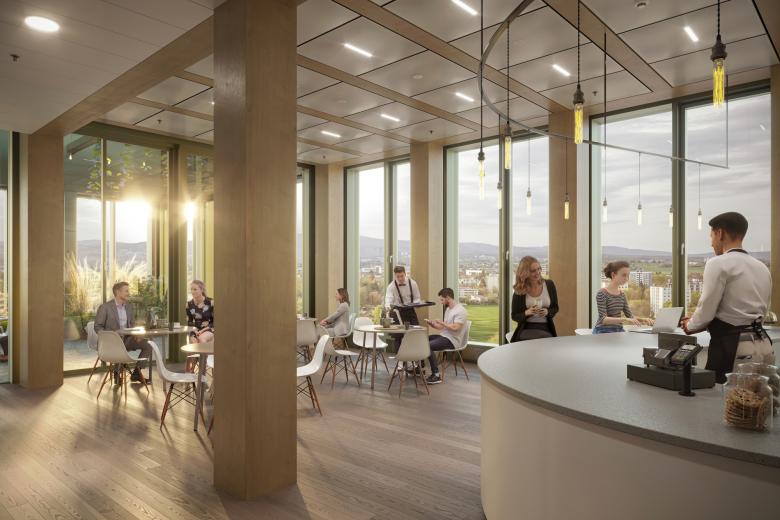 An ein repräsentatives Foyer im Erdgeschoss schließen ein Mitarbeiterrestaurant mit Café, weitere Gemeinschaftsbereiche wie ein Yoga- und Fitnessraum sowie Umkleiden und Duschen an. Große Fensterflächen sorgen für ausreichend natürliche Belichtung der Büroflächen. Auf insgesamt vier Dachterrassen werden Orte für Outdoor-Work, Entspannung und Kommunikation geschaffen. Den Überblick behält man von den Sundowner Dachterrassen mit Roof-Top-Bar und Ausblick über das Rhein-Main-Gebiet.