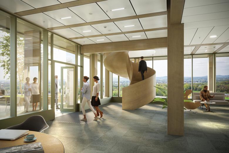 Mit ›The Change‹ entsteht das erste Holz-Hybrid-Bürohochhaus in Eschborn. In dem 60 Meter hohen Office-Tower entstehen auf 15 Geschossen rund 13.500 Quadratmeter flexibel teilbare Mietflächen mit besonderer Aufenthaltsqualität. Bei der Holz-Hybrid-Konstruktion werden die Baustoffe Holz und Beton ideal miteinander kombiniert. Beton kommt in den Untergeschossen, dem Erschließungskern und bei den aussteifenden Bauteilen zum Einsatz. Holz wird ebenfalls als konstruktiver Werkstoff eingesetzt, der anteilig Beton ersetzt und so den CO₂-Footprint des Hauses erheblich reduziert. Es wirkt aber auch auf die Innenräume positiv und erzeugt eine angenehme und behagliche Arbeitsatmosphäre. Daher bleibt beim >The Change< die Holzkonstruktion in den Innenräumen unverkleidet und präsentiert nachhaltig den Anspruch des Projekts und der zukünftigen Nutzer.