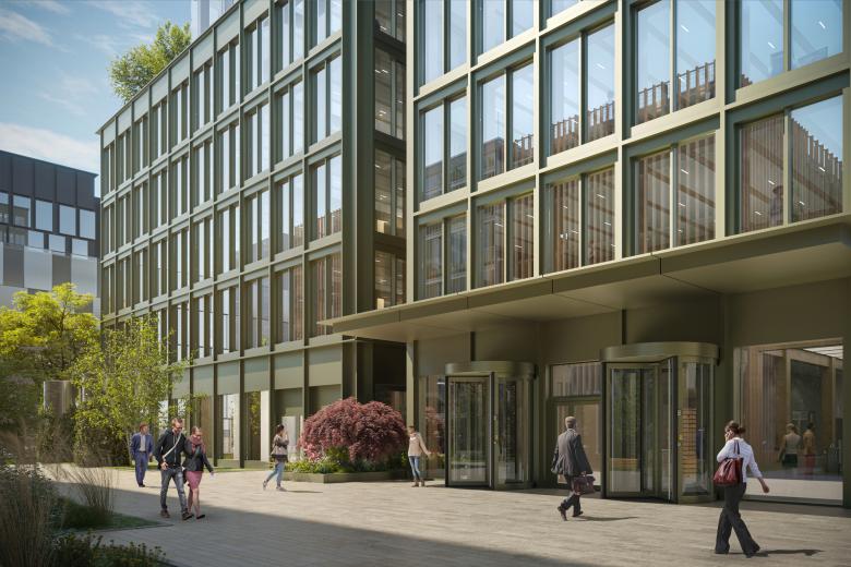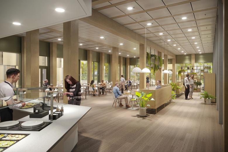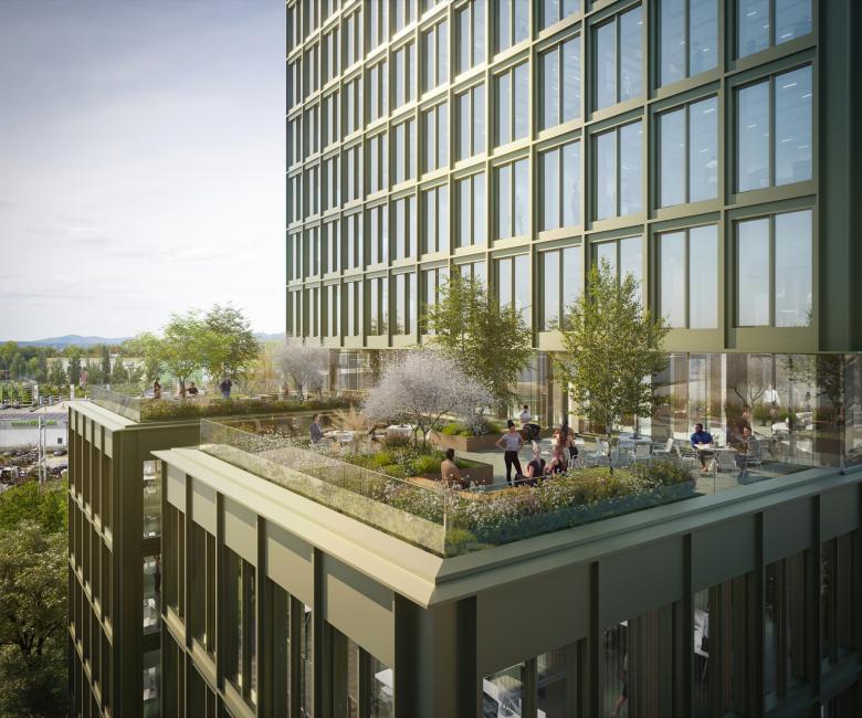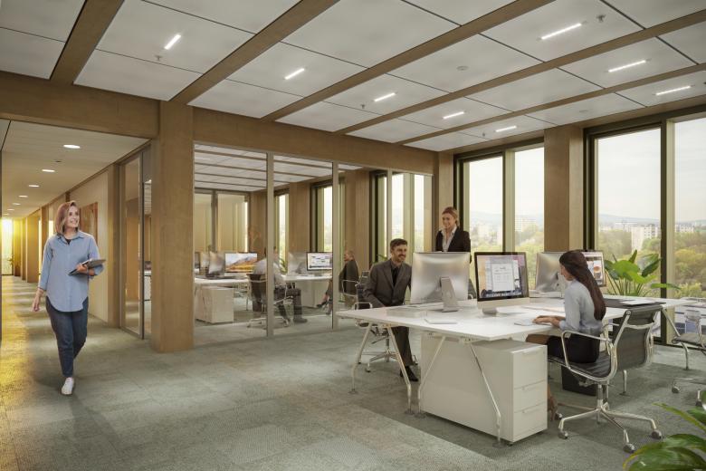 Die Energieversorgung erfolgt überwiegend durch Geothermie und Photovoltaik – nur Spitzenlasten werden über Gas abgedeckt. Ladestationen für E-KFZ und E-Bikes, Sport- und Umkleideräume, sowie die gute Anbindung an das Verkehrsnetz zählen zu den weiteren Stärken. Der Baumbestand auf dem Grundstück bleibt erhalten und wird um eine vielfältige Bepflanzung ergänzt. Zusätzlich werden die Dachflächen begrünt, was insgesamt zur Verbesserung des Mikroklimas und der Biodiversität beiträgt. Über ein smartes Wassermanagement werden die Grünflächen über Retentionsdächer, eine Zisterne und Regenwassernutzung bewirtschaftet.