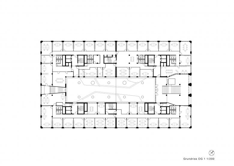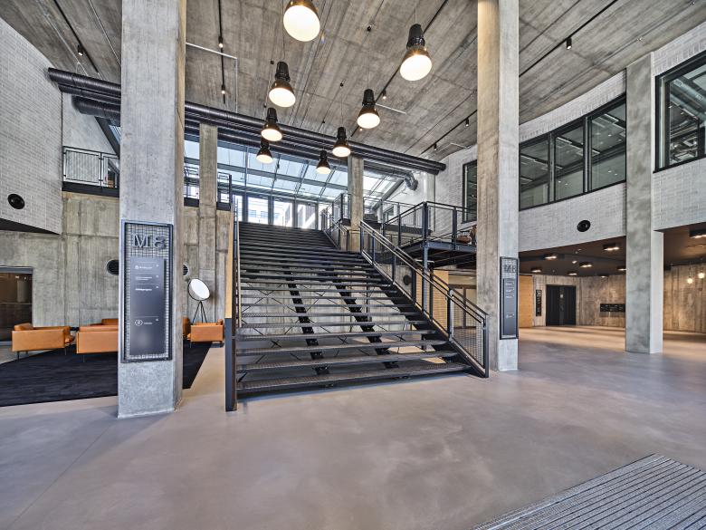 Das Foyer und der Innenhofgarten bieten Raum für alle Nutzer und übernehmen eine wichtige Verteilerfunktion im Gebäude. Als besondere Zugabe gibt es eine spektakuläre 10m hohe und 31m lange Rutsche vom vierten Obergeschoss in den Hof. Funktional ist das Gebäude für einen Einzelnutzer oder mehrere unterschiedliche Nutzer ausgelegt. Die Bürogeschosse zeichnen sich durch frei teilbare Flächen und eine großzügige natürliche Belichtung aus. Mieteinheiten lassen sich von 400 m² bis 3000 m² je Geschoss zusammenschalten.