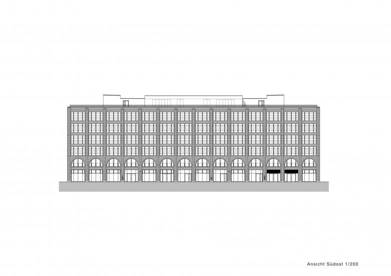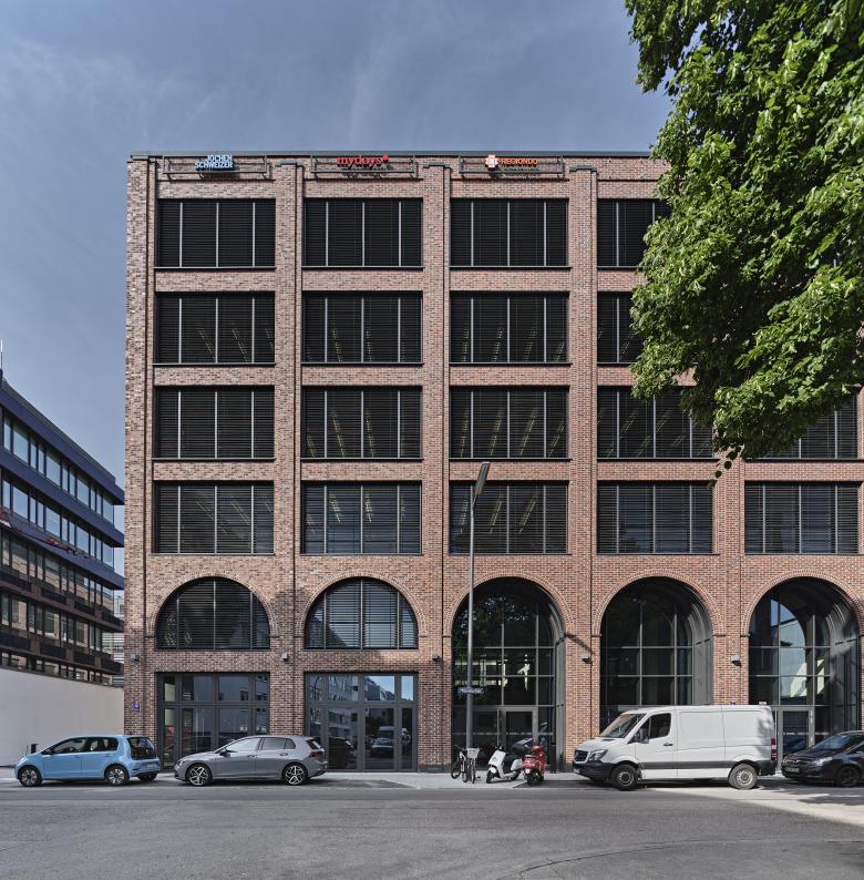 Das Bürogebäude M8 (Mühldorfstraße 8) befindet sich im Münchner Osten am Rande des dynamischen Werksviertels. Das Grundstück hat eine Größe von ca. 4.700 m² und liegt zwischen den Meisterschulen und zukünftigen Neubauten. Aufgrund der Lage in zweiter Reihe zur Friedenstraße und der gleichförmigen postmodernen Architektur im direkten Umfeld sollte der Neubau einen auffälligen Kontrapunkt im Erscheinungsbild darstellen. Das gestalterisch anspruchsvolle und maximal flexible Bürogebäude passt sich in der Höhenentwicklung den beiden Nachbarn an. Die Kubatur des Gebäudes mit Seitenlängen von 76 m, bzw. 46 m nutzt das Grundstück optimal aus. Die historisierende Fassade lehnt sich bewusst an die Gewerbearchitektur des 19.Jahrhunderts an. Die Architektur spannt den Bogen vom Industriebau über das Kontorhaus bis in die Neuzeit. Die sorgfältige Proportionierung und die feine Gliederung der Fassade verleihen dem Baukörper eine strenge Leichtigkeit. 44 Rundbögen fassen Erdgeschoss und erstes Obergeschoss und harmonieren mit der horizontalen Betonung der Regelgeschosse. Die Gestaltung mit rot-braunen Ziegeln und großen Fensterflächen interpretiert traditionelle Klinkerfassaden neu. Lisenen in jeder Achse betonen das elegante Erscheinungsbild. Nach außen wirkt das Gebäude geschlossen und introvertiert, jedoch eröffnet sich hinter den Bögen eine vollkommen neue Welt.