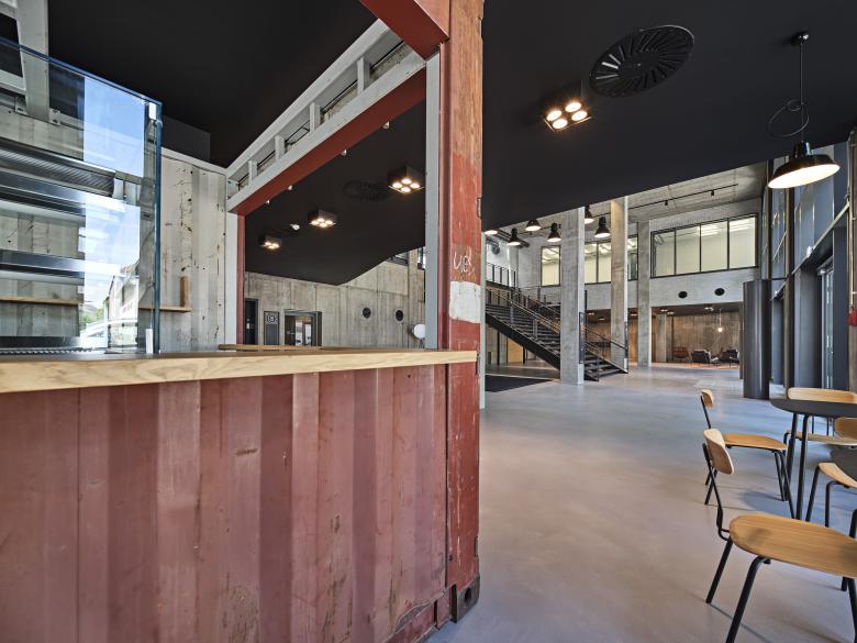 Architekturprägend ist ein zweigeschossiges Foyer mit Cafébar, welches nahezu die gesamte Breite des Gebäudes einnimmt, und über eine imposante Treppe in einen im ersten Obergeschoss verorteten Hochgarten übergeht. Schwarz-weiß Kontraste, Sichtbeton und schwarzer Stahl bestimmen die Innenarchitektur um einen Gegenpol zur Fassade zu setzten.