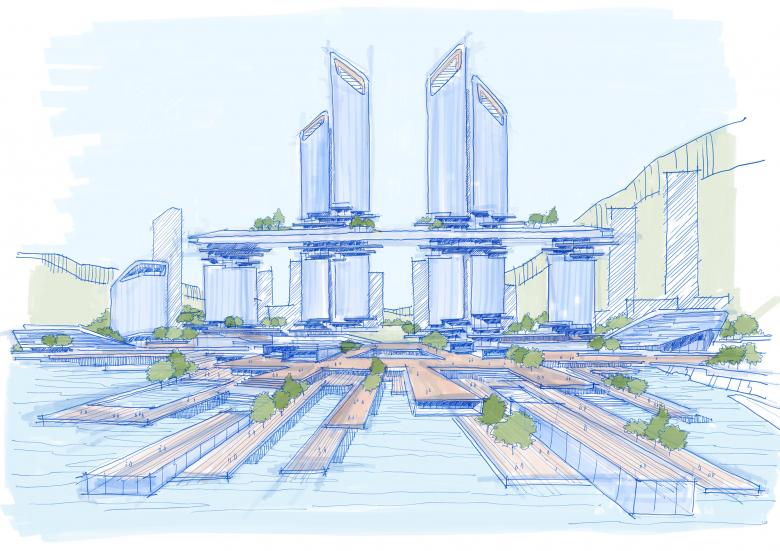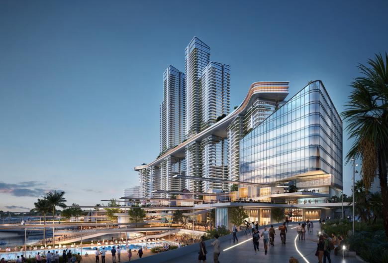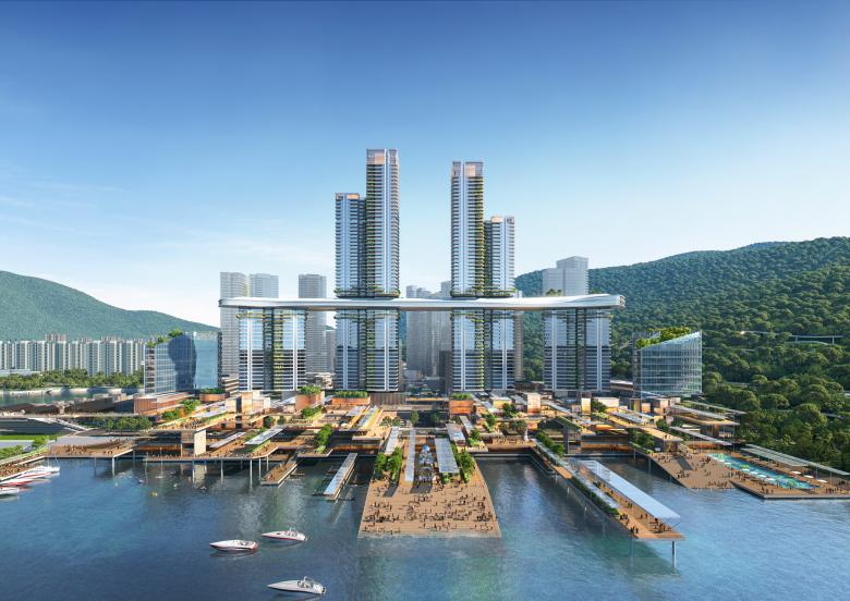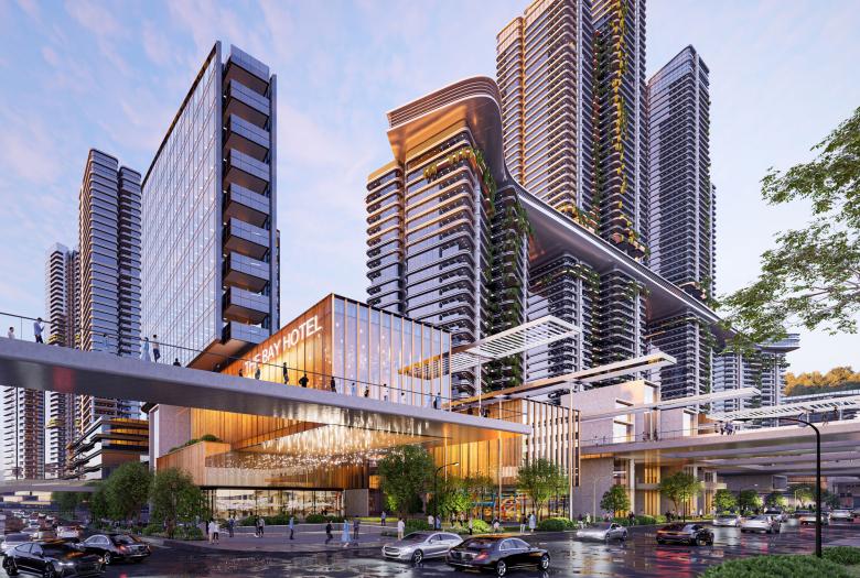Towering elegantly along the waterfront, an iconic architectural masterpiece, stands as a visual icon, welcoming visitors who arrive by sea. Drawing inspiration from the container terminals' portainers, four high-rise residential towers are interconnected by a skydeck at above 100 meters. This innovative design creates the illusion of a 'floating city' against the horizon. While partially serving as a private club facility for residents, the skydeck also offers public access via separate lifts, ensuring that this unique space can be enjoyed by all.