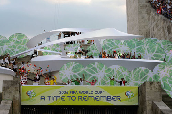 Über 200 Darsteller sowie die FIFA-Showacts Il Divo und Shakira waren in die lebhafte Inszenierung auf der Treppenanlage des Marathontors eingebunden. Fan-Trommler und -Tänzer, Fahnenträgerinnen als farbenfrohe Botschafterinnen der FIFA Kontinentalzonen und Berliner Streetdancer boten auf der Showbühne und in ihrer unmittelbaren Umgebung eine euphorische Performance. Mehr als 60 Akteure bildeten eine bewegte, grafisch gestaltete Kulisse, indem sie nach einer ausgefeilten Choreografie textile Schirme als Bildträger über ihren Köpfen schwenkten. Das aufgedruckte Motiv verwies in abstrakter Form auf den Hauptschauplatz der WM – als grün-weiße Komposition aus Rasenstruktur und Feldlinien.