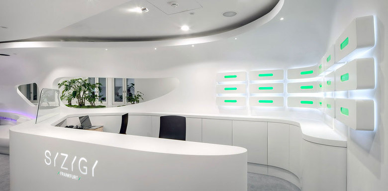 In zentraler Innenstadtlage nahe der Frankfurter Börse entstand auf 950 qm eine inspirierende Arbeitsumgebung, die auf atmosphärische Weise die zukunftsorientierte Unternehmenskultur von Syzygy zum Ausdruck bringt. Eine in die Bestandsarchitektur eingefügte, 22 m lange Freiform ist optischer und kommunikativer Mittelpunkt des Büros. Sie vereint Zonen für informelles Arbeiten und Rekreation in einer fließend geformten Lounge-Landschaft und bietet Besuchern Einblicke in das kreative Agenturleben.