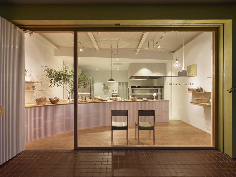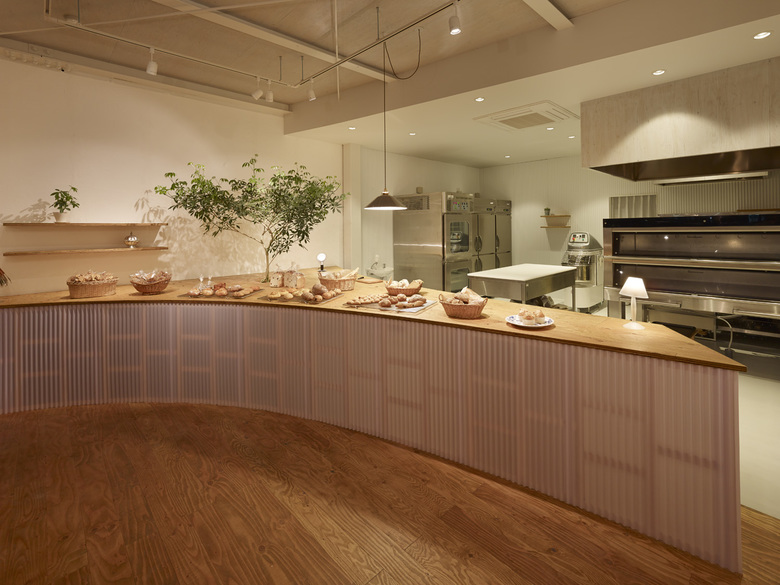 岐阜県岐阜市のパン屋さんのインテリア改装計画。ここでは厨房と売り場を等価と考え、それぞれの間に大きなテーブルのような台を挿入することとした。このテーブルは、パンを飾るディスプレイにもなれば、レジスペースにもなり、パンをスライスしたりこねたりする作業スペースになったり、店主は店の状況を常に把握しながら、パンの生産量に応じて様々な展開が可能となる。結果的にこのテーブルはパンの工房に伺うようなオープンな状態を生み、買い手とつくり手の間にコミュニケーションを生み出すものとなり、パンを焼いてから売るまでの過程をダイナミックに演出できる豊かな買い物空間となったのではないかと考える。