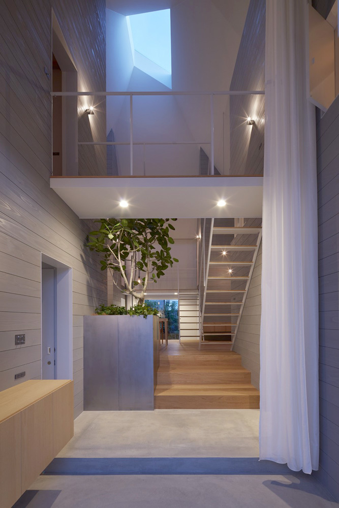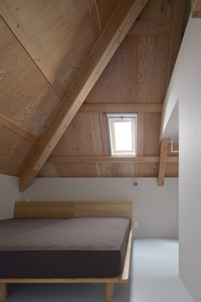 愛知県岩倉市での住宅の計画。敷地の3方向を建物に囲まれ北側の接道部分は公園に面する敷地であった。今回は大きな2つの要望をいただいた。ひとつは周囲にあまり開くような構成とせず閉じながらも解放的な空間がほしい。もうひとつは家族の気配を感じながら様々な居場所をもつ間取りとしたい。というものであった。ここではプライバシーを必要とする空間を挿入した2階建てのボリュームを柱のように4隅に配置し、その隙間を大きな吹き抜けを持つ共有部分のLDKとして、さらに頂点には大きな天窓を持つ空間構成とした。こうすることで高さによる開放性と上部からの自然光による明るさと光のうつろいを感じさせる空間を確保させた。全ての部屋が吹き抜けに接することで天窓の明るさによる恩恵を受け、様々な場所から吹き抜けを挟んで家族とのコミュニケーションを容易にすることを狙いとしている。また2階部分は全てブリッジでつなげている。これは生活導線をスムーズにするものでありながら、ロフト的な空間をちりばめて多くの居場所をつくると同時に、上下のコミュニケーションを生むものとしている。様々な場所を持ちながらも使い勝手を損なうことなく、家族と自然を感じながら快適な空間を実現した計画となった。