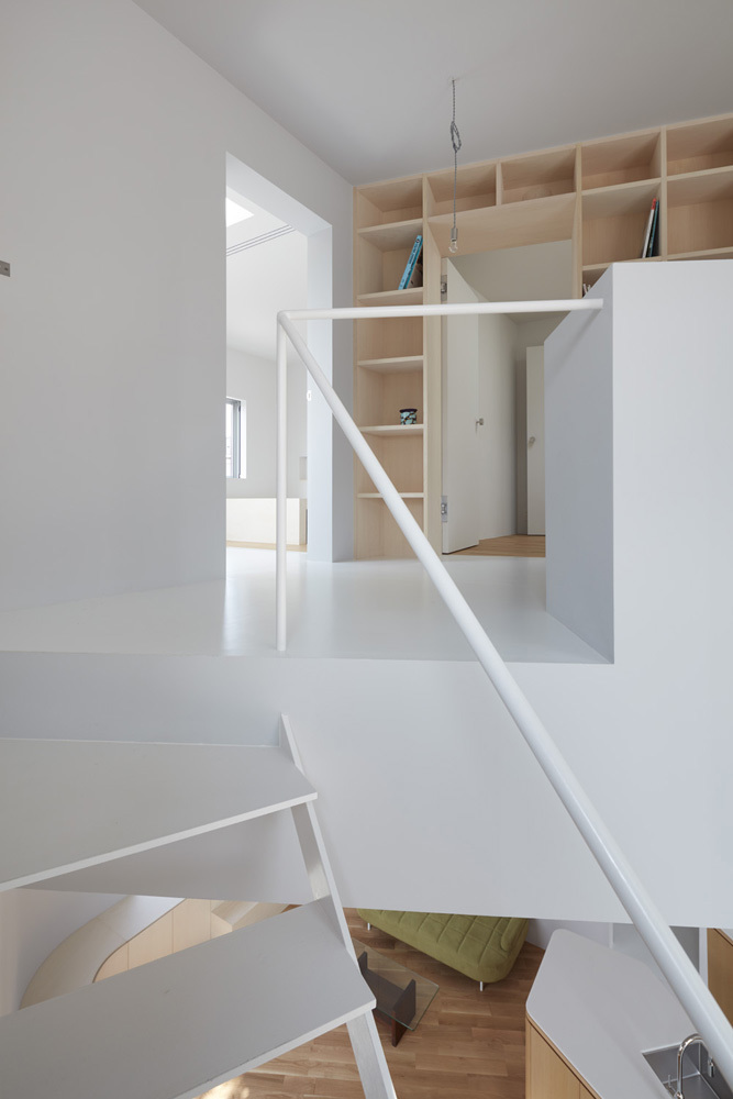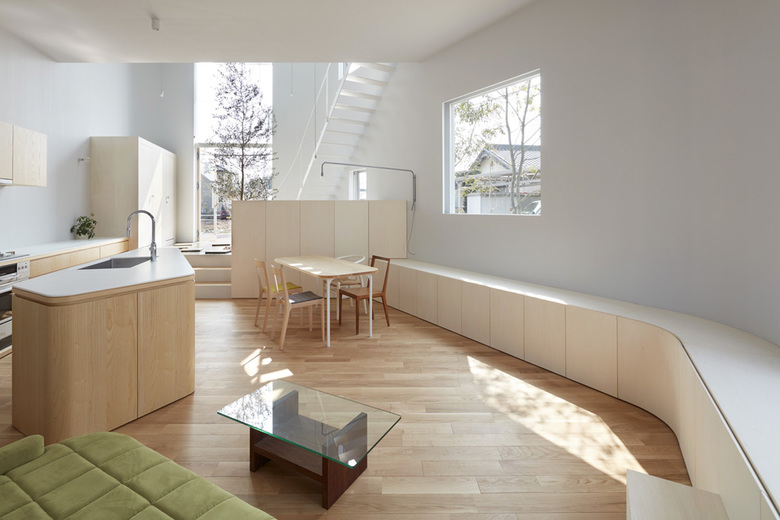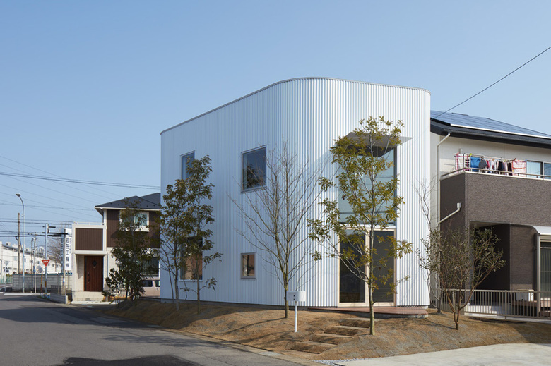 愛知県丹羽郡大口町で敷地の3方向が道路に面する細長い角地での計画。Webデザイナーのご主人の事務所としても使用しながら奥様と日常での距離感を保ち、天井の高い開放感なLDK空間を持った仕事場兼住まいを望まれた。敷地の東西が細いために、建物の幅を確保することが難しい。ここでは必要な分だけ斜めに平面をとり5角形の形状に。そして建物の角を丸くすることで角地に立つ建物の圧迫感を軽減するとともに、敷地に余白をつくることで多くの植栽をするスペースを確保した。そうすることで建物と道路の距離をとりながら、印象を柔らかなものとすると同時に、余白に設けた植栽が周辺環境に対して森のような役割となることを目指した。そして内部で採用した壁の曲線は、角という境界を無くし空間的な広がりを感じさせるものとして貢献している。結果的にその形状は、住宅と事務所の中間的な佇まいを持ちながら、内部空間の曲線をベースとした包まれるような質感と自然を感じられる開放的な空間を得る事を可能とし、住み手にとっても周辺環境にとっても豊かさを提供することを意図している。