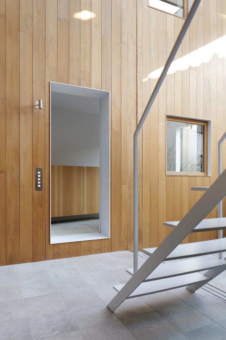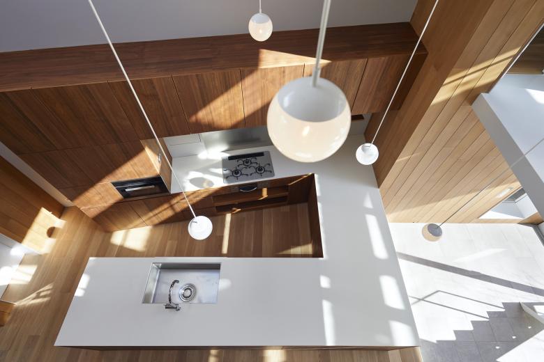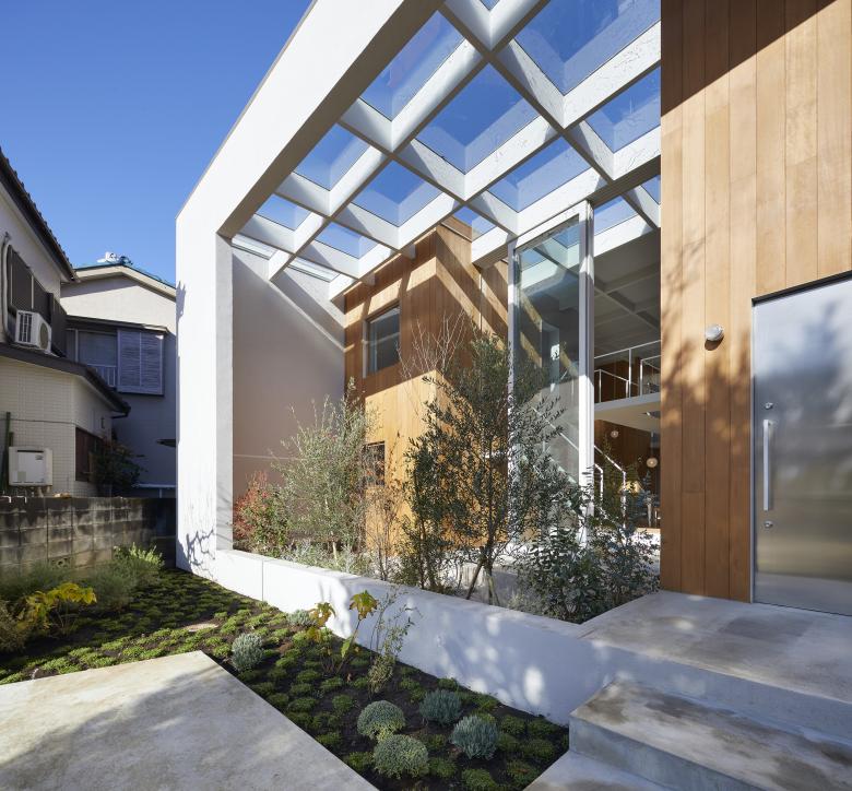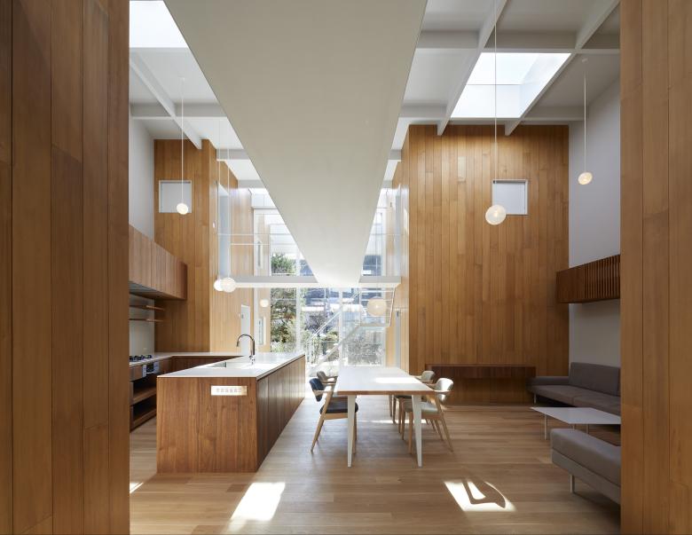 旗竿状で周囲を建物に囲まれている敷地での住宅の計画。施主からは自然を感じることができ広く開放的な空間を求められた。ここで考えたのは、まず2層分の吹抜けのワンルーム空間をつくり、外部→屋根のある外部→外部のような内部→完全な内部という順番で場所を配置して、中央のLDKに向かって外部から内部をグラデーション的に配置すること。そこから個室を点在させた板貼りのボリュームの中におさめて各々をブリッジでつなぎ、プライバシーを確保しつつもどこにいても家族と自然を感じられるようにした。そのブリッジはロフトのような廊下のような存在となり移動する楽しさを得られるものとしている。そして大きな特徴のひとつとして、南北に高さ5mの大きなスライドドアを配置した。全開すると、あたかも2層分の壁が無くなったように外とつながり、風が一気に部屋中を通り抜ける。この状況はもはや家全体が屋根のある外のような状態となり、開放的でありながらも閉じたような安心感を得ながら自然を感じられる豊かさを実現させるものとなっている。 部屋の配置と境界を区切る建具のありかたを考えて、家族との距離感と自然との向き合い方を考えた住宅である。