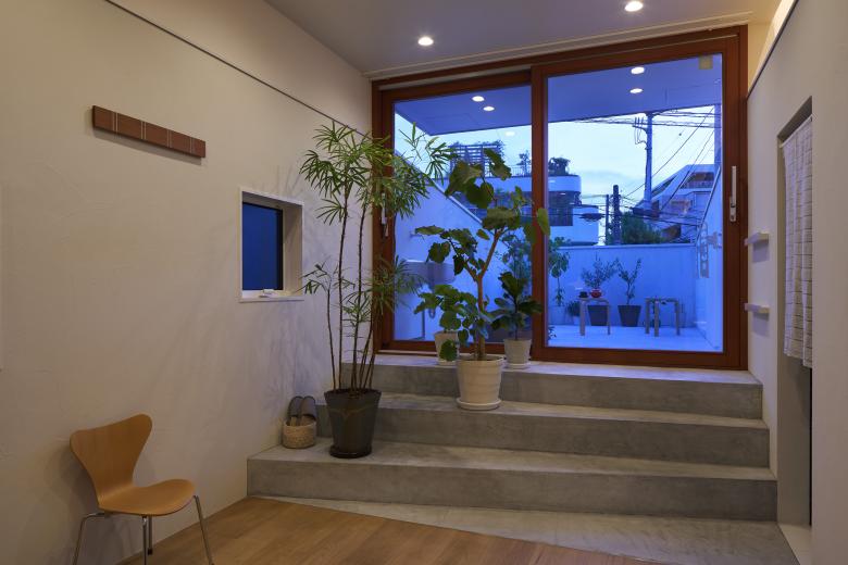 The balcony, which is directly accessed by an external staircase, also function as the entrance porch. The space continues to extend from the entrance porch to 1st floor hall, dining room, living room stepping down at each space and gradually descending as move further into the house. The entire space of 1st floor is 31 tatami mat or In total, the area is 31-tatami mat or 57 sqm, and the ceiling height of the living room at the far end is 3.1 m.
