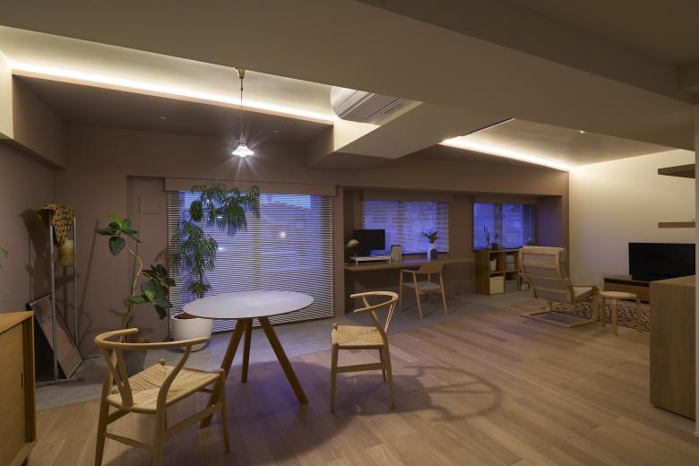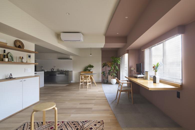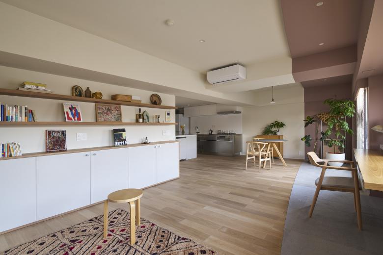 While the advantage of the client’s apartment is a wide frontage with many windows, initial layout made it impossible to fully enjoy the light and wide view due to the space being segmented by too many rooms. We decided to remove the walls to intake the light and view in an open space where the wind could pass through the windows. The bathroom was placed in the center of the apartment as detached room, and the bedroom can be closed with movable partitions to secure privacy.