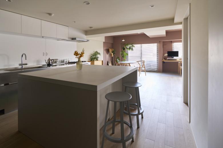 For this reason, the kitchen island countertop is placed in front of the entrance on the hallway side so that it catches attention of the visitors when they open the door. The square shape of the countertop provides good accessibility, storage space and workability.