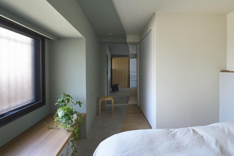 The wood flooring is chosen for living/ dining room and bedroom for barefoot comfort, and the walls and ceilings are mostly white to give neutral finish. The “Shores” floors are either tiles or carpet depending on its function, and the walls and ceiling are finished in two colors. One is a red brown sampled from the surrounding environment seen outside the railroad side of the window, and the other is a moss green sampled from a café run by the client that is within one-minute access from the door of the apartment.