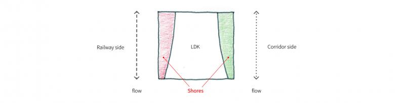 We created strip-shaped “shores” on both sides of windows; railroad-side and hallway of apartment-side that face this slow laid-back flow.