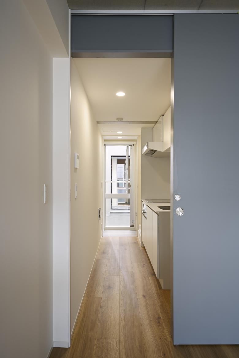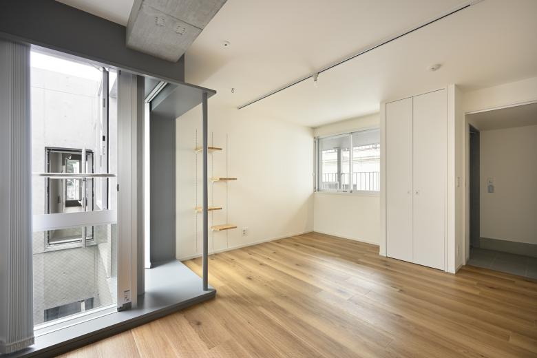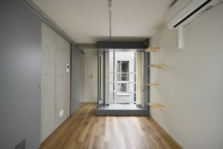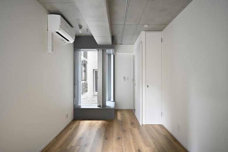 一般的なワンルームの住戸は、廊下を中央に設けて、その左右にキッチンやユニットバスなどの水回りを設置して、奥にベッドルームがあるパターンが多い。しかしこの集合住宅では、水回りを建物ヴォリュームの中央に寄せて廊下を壁際にすることで、6つの「窓先空地」をつなぐ抜けを住戸内に生み出している。それにより、前面道路から、敷地の奥まで視線の抜けができ、風の通り道ができる。2人用の1LDK住戸がある奥のヴォリュームも、水回りを中央に設けて、リビングとベッドルームが、玄関やキッチンを通って回遊できる間取りにしている。住戸の開口は「窓先空地」に面する部分だけに設け、抜けの内側にプライバシーを確保している。