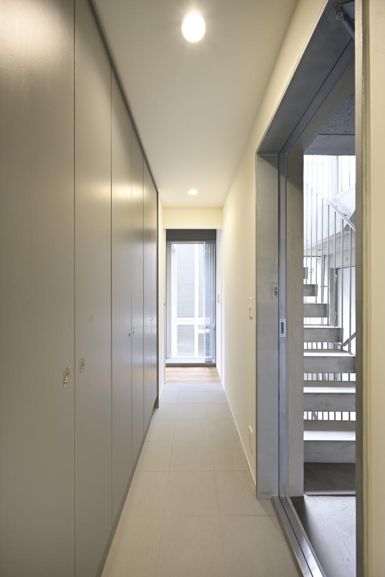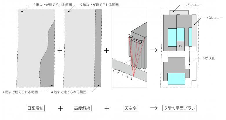 こちらの集合住宅では、このような間口が狭く奥行きの深い都心の敷地で、収益性を高める密度を保持しながら、採光・通風に配慮した快適な住環境を追求した。