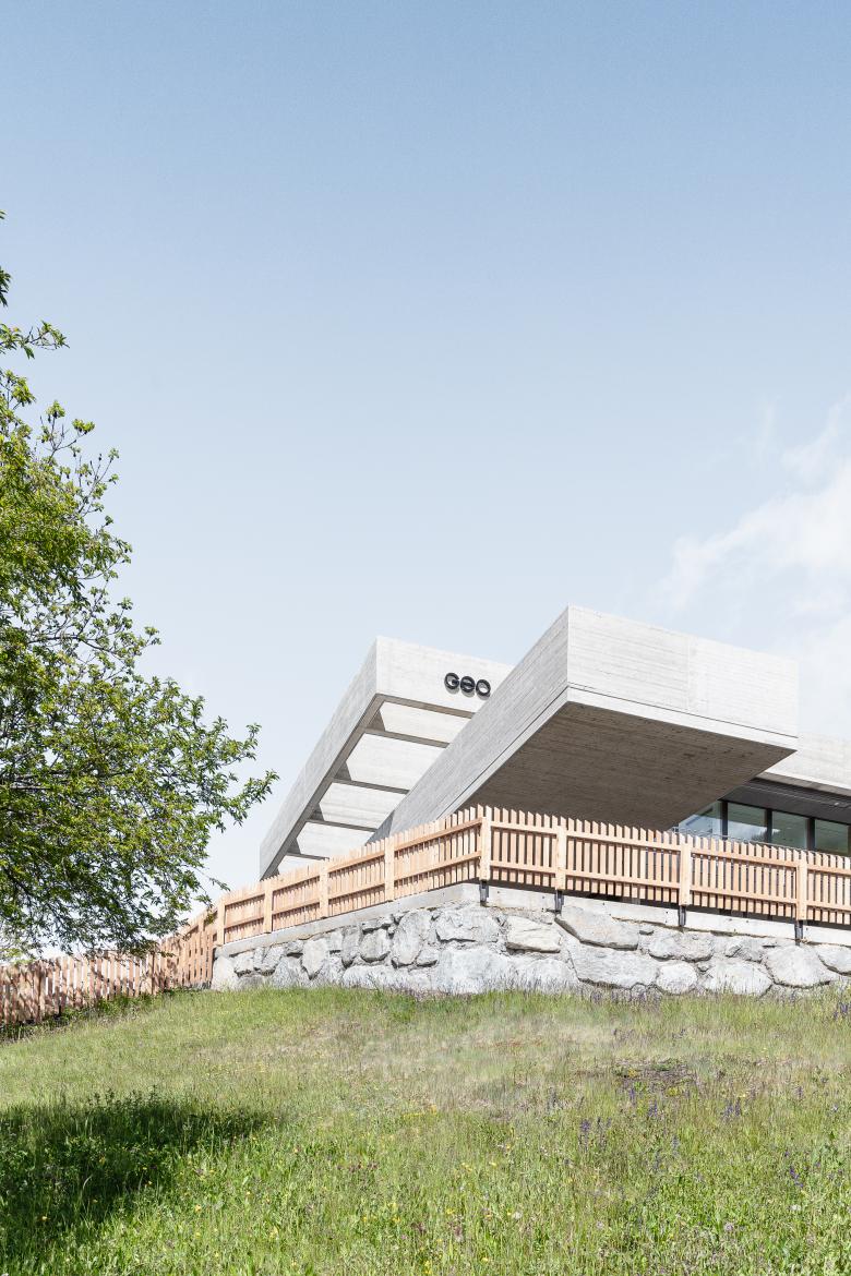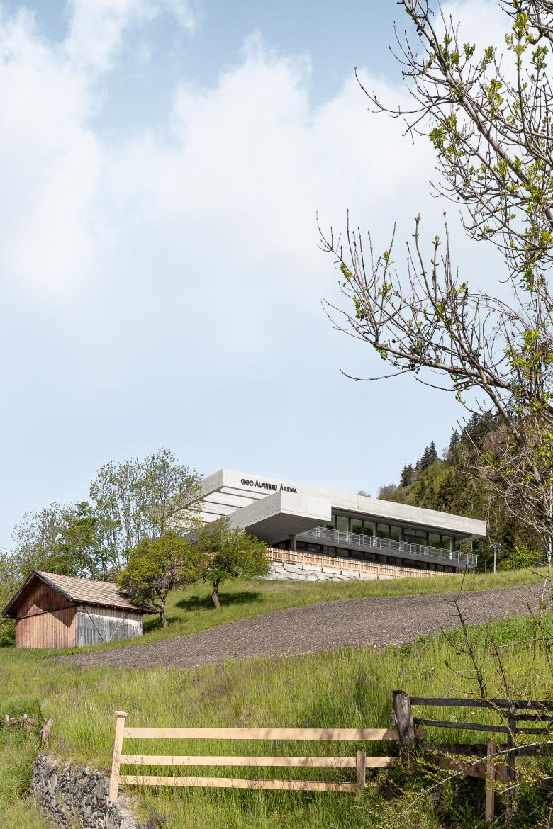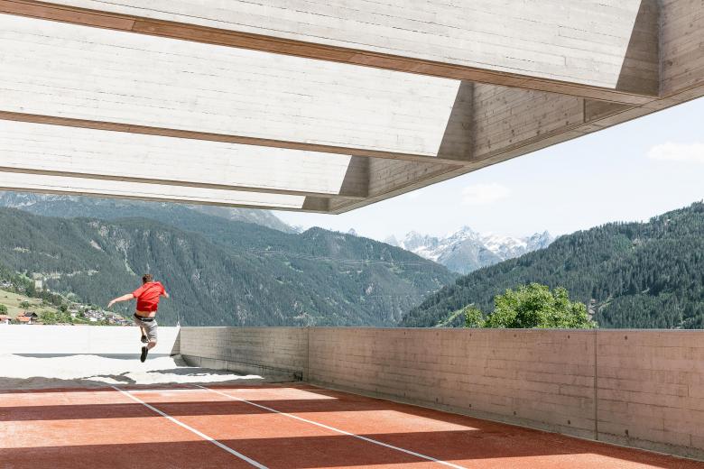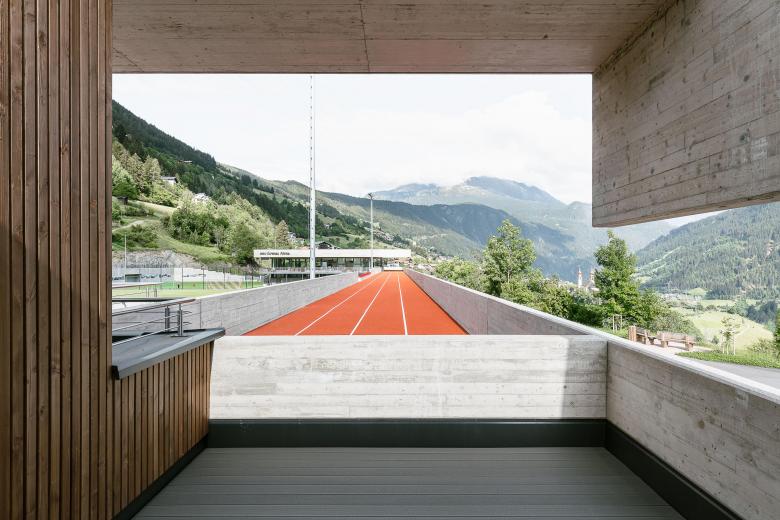 Zwanzig Jahre nach dem Dorfzentrum stellt AllesWirdGut ein weiteres kommunales Kleinod in der Gemeinde Fließ in Tirol fertig. In fußläufiger Entfernung zur Schule und zum Dorfkern steht nun ein Sport- und Freizeitzentrum mit Zuschauertribünen, Turnier- und Trainingsplätzen, mit Schwimmbad-, Leichtathletik-, Tennis- und Trendsportanlagen sowie mit einem signifikanten identitätsstiftenden Klubhaus für den lokalen Fußballklub. Topografie und Grundstückszuschnitt erforderten dabei sensible Eingriffe und einen sparsamen Umgang mit den zur Verfügung stehenden Flächen. Horizontal schwebende Ebenen – Leitmotiv des Entwurfs – wurden deshalb auf, über und an die Hangkanten gesetzt. Mit dieserart positionierten Geschoßplatten tritt wiederum auch das Klubhaus in Erscheinung. Durch die markante Abfolge baulicher Erhöhungen fügt sich der Blickfang des Sportzentrums den alpinen Hangterrassen an, während sich Unter- und Erdgeschoß in die Landschaft eingebettet zeigen. Ebenerdig befinden sich Umkleiden, Schiedsrichter- und Trainerräumlichkeiten sowie zugehörige Duschen und Toiletten. Über eine Außentreppe gelangen Besucherinnen und Besucher vom Haupteingang auf Platzniveau ins Obergeschoß: Der pavillonartige Baukörper beherbergt das Vereinslokal mit Ausschank und Gastraum, ist vollverglast und umlaufend mit