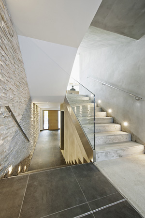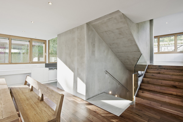 Im Zentrum des Wohnraums steht ein roh belassener Stahlbetonkern mit Küche und Feuerstelle. Er trägt und erschließt auf diskrete Weise den als Dach dienenden privaten Rückzugsbereich: Hier befinden sich auf separaten Ebenen die Schlafzimmer für Eltern und Kinder, jeweils mit einer vor Einblicken schützenden Loggia ausgestattet. Bekrönt wird er von der Bade- und Saunaebene, deren dazugehörige Terrasse einen weiten Ausblick über den umliegenden Wienerwald bietet.