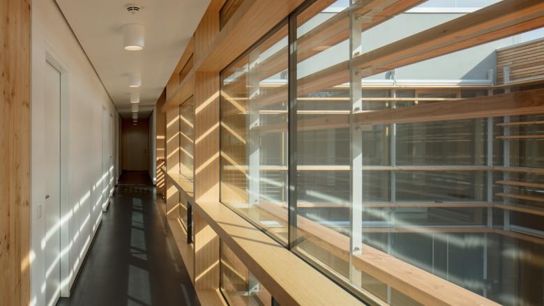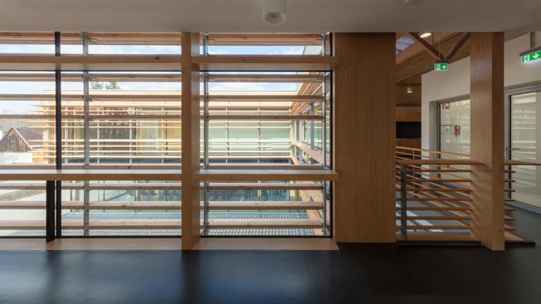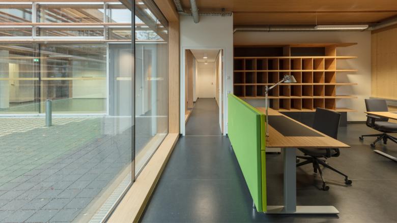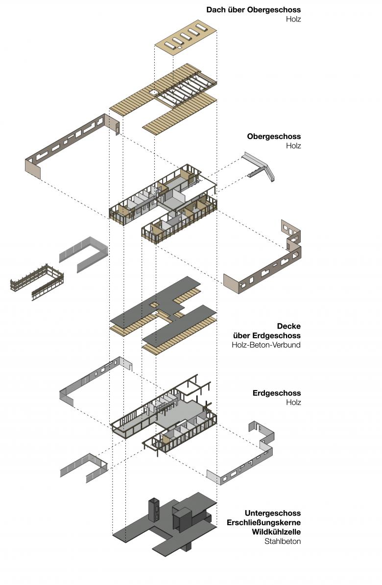 Das Gebäude ist als konstruktiver Holzbau über einem kleinen Untergeschoss aus Beton errichtet. Das Tragskelett und die hybriden Holz-Beton-Verbunddecken bestehen aus BauBuche. Dieser in Thüringen entwickelte Furnierwerkstoff aus heimischer Buche ermöglicht es aufgrund seiner Materialeigenschaften, sehr leistungsfähige Holzkonstruktionen zu realisieren. Die hinterlüftete Fassade ist als Holzrahmenbau mit Lärchenholzschalung oder Putzfassade ausgeführt. Die großzügigen Glasflächen des Innenhofs erleichtern die externe und interne Kommunikation und erlauben den Blick auf die Holztragkonstruktion sowie zahlreiche weitere Details aus heimischen Hölzern im Inneren. Als konstruktiver Holzbau mit einer Kombination aus bewährten und neuartigen Materialien zeigt der Entwurf, was Holz als nachwachsendes und wirtschaftliches Baumaterial leisten kann.
