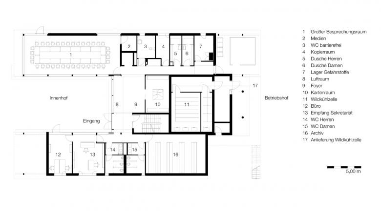 Durch seine klare funktionale Struktur mit dem in der Mitte liegenden Gruppenbüro der Revierförster befördert der Entwurf den Austausch unter den ständig hier anwesenden Mitarbeitern und den nur temporär im Büro arbeitenden Förstern. Holzwerkstoffe, weiße Putzflächen und die für das Projekt angefertigten Tischsysteme mit farbigen textilen Akustikelementen sorgen für eine heitere Arbeitsatmosphäre und unterstreichen die Integration von Konstruktion, Gebäudehülle, Innenausbau und Möblierung.