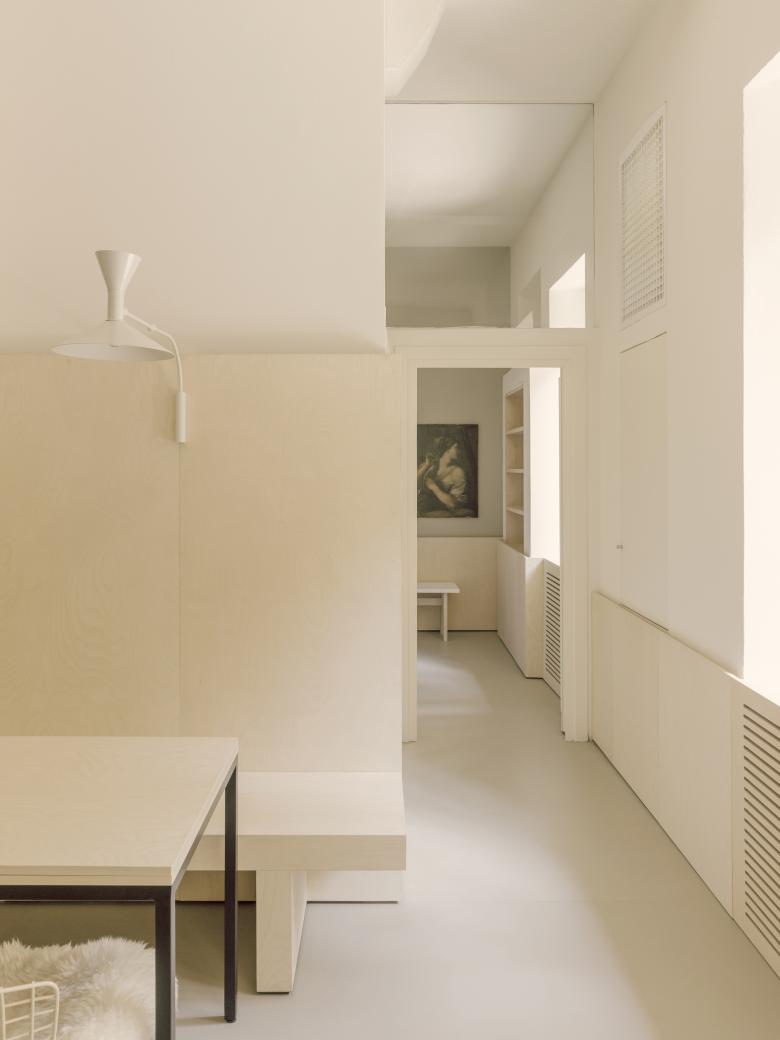 Every piece of furniture has been custom-designed, shaping the small spaces with precision and meticulous attention to detail.