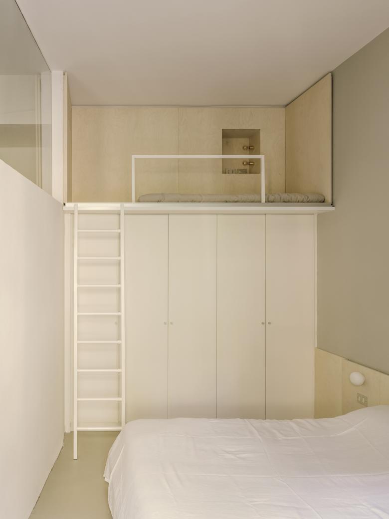 The master bedroom includes a third bed, cleverly integrated above the wardrobe, making the most of the apartment’s height without cluttering the room.