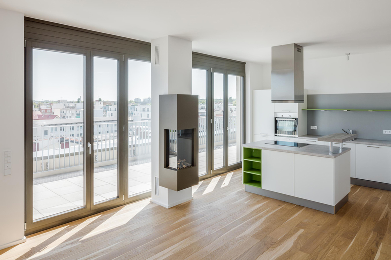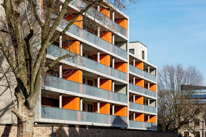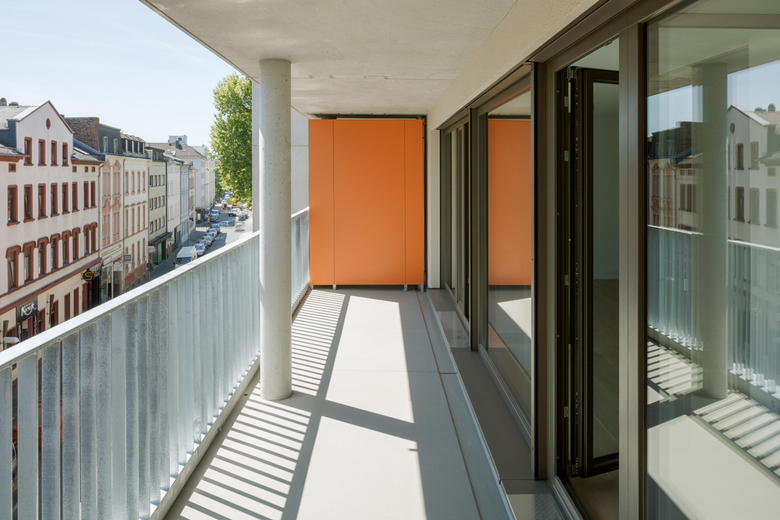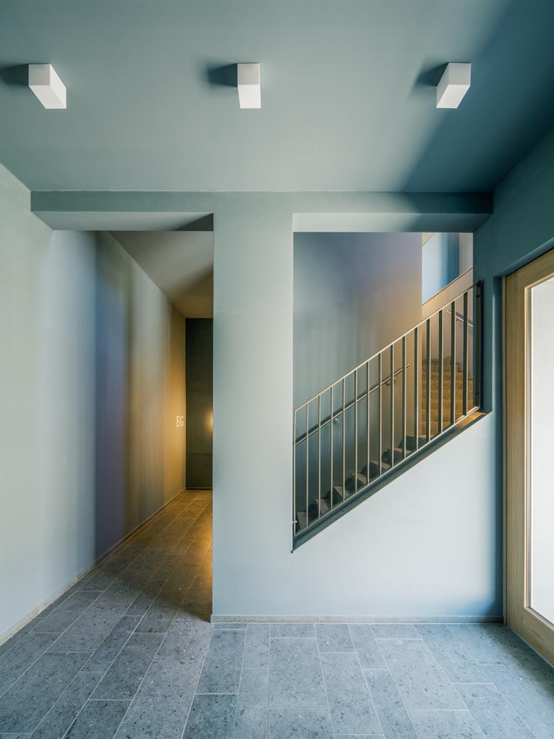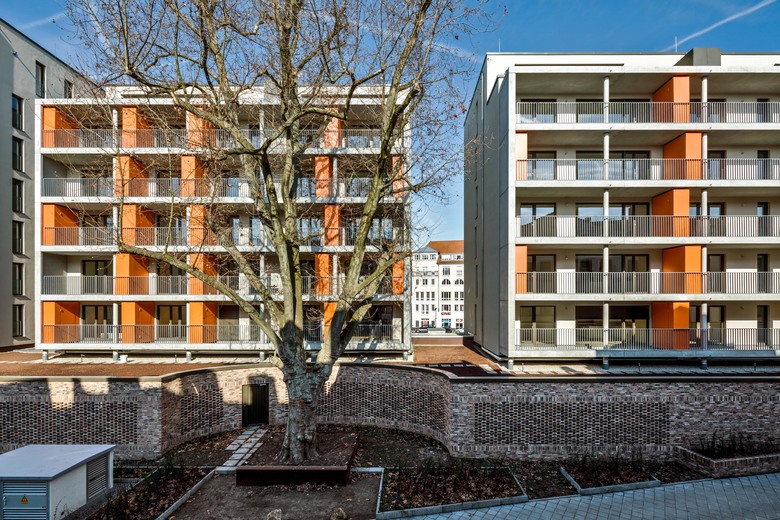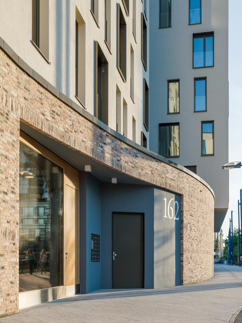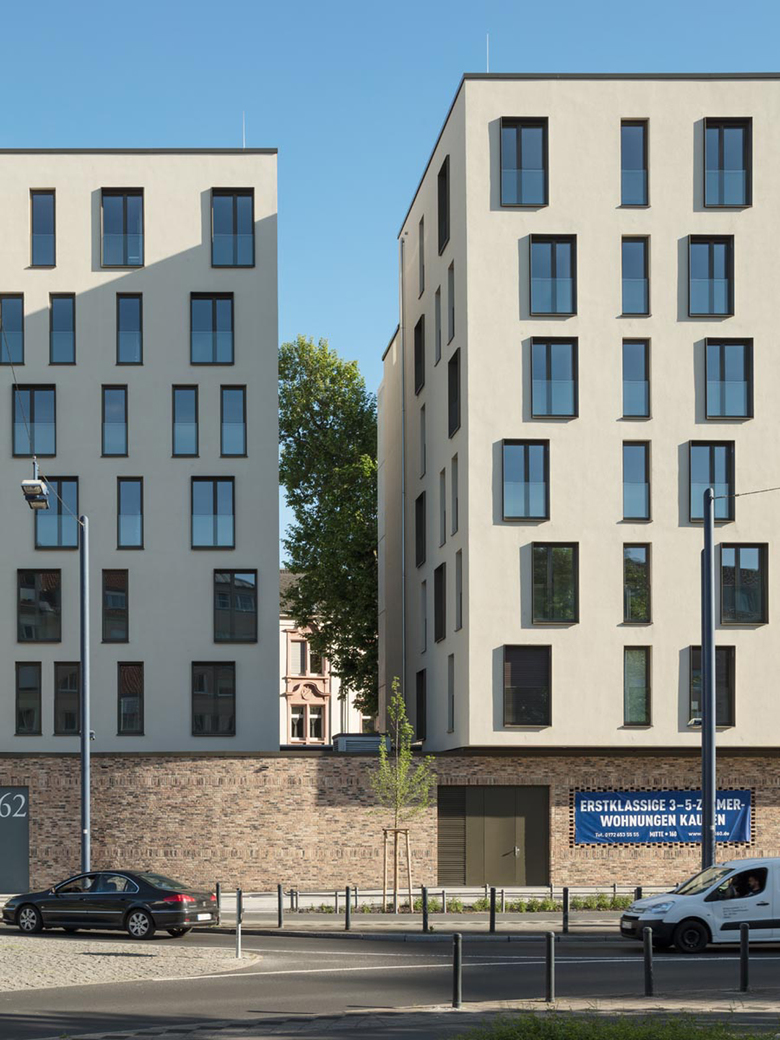 Energetisches Konzept – Das Gebäude entspricht dem Standard KfW 55 (2017), beheizt mit Fernwärme. Ein Hausnetz verteilt Wärme und Kaltwasser in einzelne Wohnungsstationen die Heizung und WW-Bereitung speisen. Kontrollierte Belüftung über Nachströmelemente in Fassade und Fenstern und über eine zentrale, feuchtegesteuerte Absaugung in den Nebenflächen.