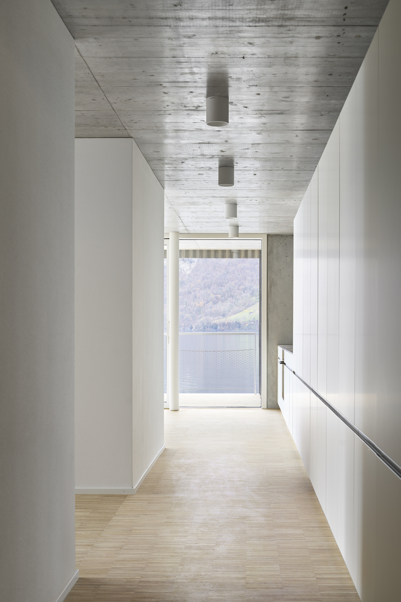 Der Ort ist stark geprägt durch seine gewerbliche Geschichte. Die Bauherrschaft als Familienunternehmung mit einer starken regionalen Verankerung ist Teil dieser Ausprägung. Zuvor stand an diesem Ort eine Werk-und Lagerhalle. Die geschichtlichen Hintergründe des Ortes im Projekt einfliessen zu lassen, war Teil des Konzepts und leitend für den Entwurf. Ortsbauliche und ökonomische Aspekte, konstruktives Konzept, Oberflächen und Materialien sind dabei die wichtigsten Parameter. Die Geschichte des Ortes wird wieder spür-und erlebbar mit der Gebäudeform und der mit Welleternit verkleideten Fassade mit den Bandfenstern. Die darin entwickelten Wohnungsgrundrisse sind wandelbar und charakterisiert durch Ihren atmosphärischen Bezug zum See.