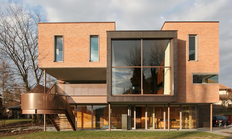 Die Anordnung des Einfamilienhauses auf dem hügeligen, parkähnlichen Areal wurde vom vorhandenen Gelände und dem Baumbestand bestimmt. Das natürliche Farbenspiel der Klinkerfassade, dem patinierten Kupfer und der zurückhaltenden Formensprache bilden den idealen Übergang vom Wohngebiet zum Naturraum. Die Casa Gallmist stellt eine dreigeschossige Villa in Massivbauweise dar. Der Zugang erfolgt über einen vorgelagerten „Aromagarten“. Neben den dezenten Farbtönen der verwendeten Materialien bildet ein großes Aussichtsfenster das zentrale Element des Projektes.