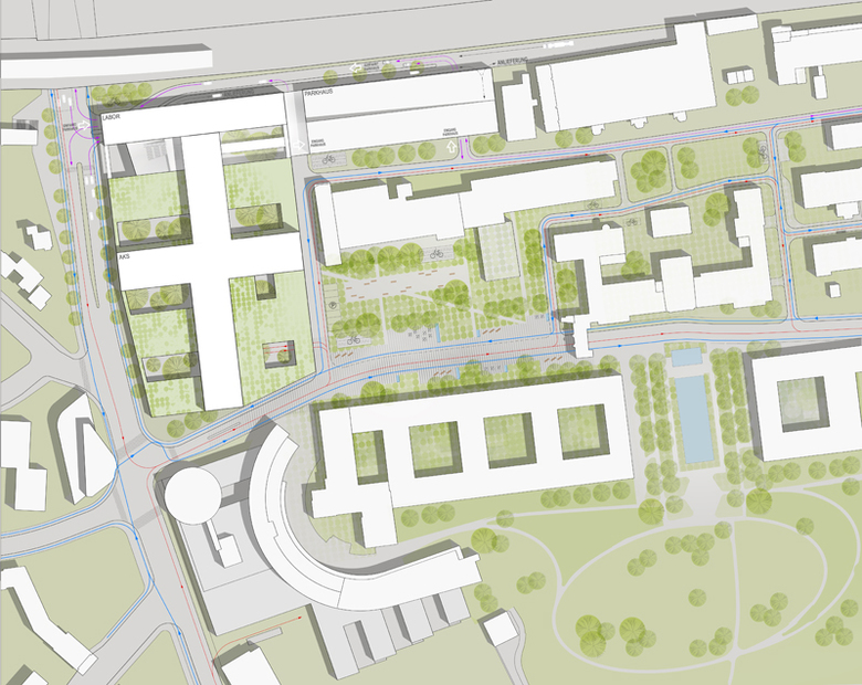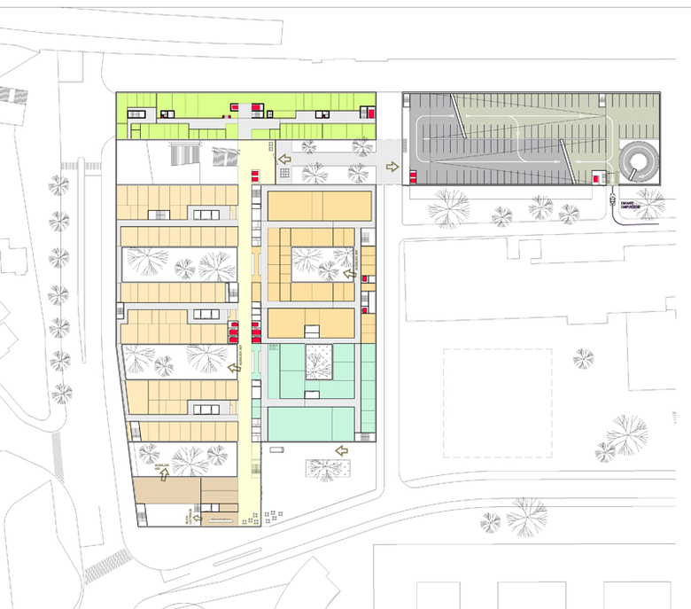 The design combines a “double-comb” structure that accommodates treatment and examination rooms with a cross-shaped area dedicated for the ward and nursery departments. This distribution is completed by a final slab that host the laboratory and that integrates seamlessly the whole building. The building complex is delimitated towards the train lines by the slabs of the laboratory and the parking garage. These three elements merge into a very functional and yet peaceful structure that integrates perfectly into the surroundings.