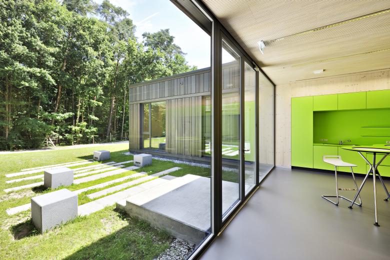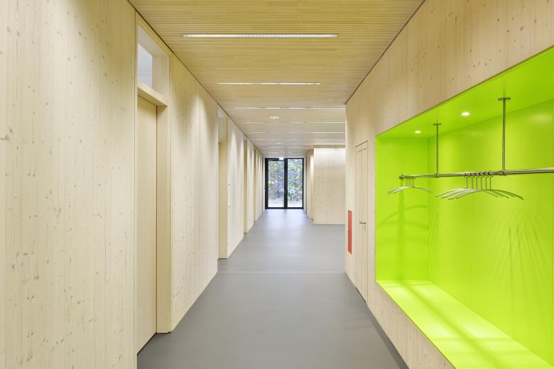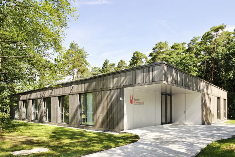 Der Neubau der Beruflichen Fachschule für Krankenpflege wurde als eingeschossiger Baukörper in mittlerer Ausstattung als Fördermaßnahme in unmittelbarer Nähe zur Clinic Neuendettelsau, einem Krankenhaus der Allgemeinversorgung, direkt am Waldrand errichtet. Das Gebäude ist nicht unterkellert. Im Erdgeschoss befinden sich neben zwei Klassenräumen, die mittels mobiler Trennwand zu einem großen multifunktionalen Raum zusammengeschaltet werden können, ein Übungsraum gleicher Größe und ein kleiner Gruppenraum. Für das Lehrpersonal stehen ein Lehrerzimmer und ein Raum für Lehrerarbeit zur Verfügung. Daran schließen die Bibliothek, der Lehrmittelraum und die Verwaltung mit je einem Raum für Schulleitung und Sekretariat an. Im Gebäudezentrum ist der Gemeinschaftsraum direkt an die Teeküche geknüpft. Die Sanitäranlagen teilen sich in Schüler- und Lehrer-WC. Als großzügige Nischeneinbauten sind Garderobe und Kopierzone zum Flur orientiert. Der Haustechnikraum ist nach Osten ausgerichtet und liegt unmittelbar neben dem Hauptzugang. Das Gebäude wurde in 8 Monaten Bauzeit in Holzmassivbauweise gebaut. Die hinterlüftete Fassade mit vertikalen Holzlamellen wird durch raumhohe Fensterelemente unterbrochen. Außerdem dienen horizontale Bänderungen der Fassadengliederung. Die Bibliothek und der Gemeinschaftsbereich werden durch großzügige Fensterflächen ebenfalls natürlich belichtet und belüftet. Der überdachte Eingangsbereich ist mit eloxierten Aluminiumblechen verkleidet. Die Freianlagen sind sparsam gestaltet und stärken den vorhandenen Grünraum, der geprägt durch den imposanten Kiefernbestand ein adäquates Umfeld bildet.