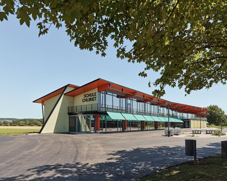 Das Schulhaus ergänzt das offene, von der Landschaft geprägte Gefüge im Chliriet mit einer bestehenden Mehrzweckhalle, den Sportanlagen und alten Bäumen. Es steht als langes, schmales und flaches Haus am begrenzenden Flurweg und spannt mit der Mehrzweckhalle einen grossen Pausen- und Zugangsraum auf. Das ausladende Flugdach trägt zu dieser Fassung bei und gibt der Architektur ihren eigenen Ausdruck.