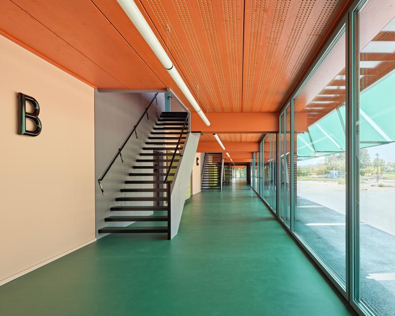 Zur einfachen Fügung des Holzbaus kommen sämtliche weiteren Elemente additiv hinzu und bleiben über ihre Farbe eigenständig. Im Haus ist alles bunt: es gibt keine Materialfarbe und auch kein Weiss. Der Innenraum entsteht über das Zusammenwirken der einzelnen Farben. Die Polychromie nimmt das Leben des Schulalltags vorweg.