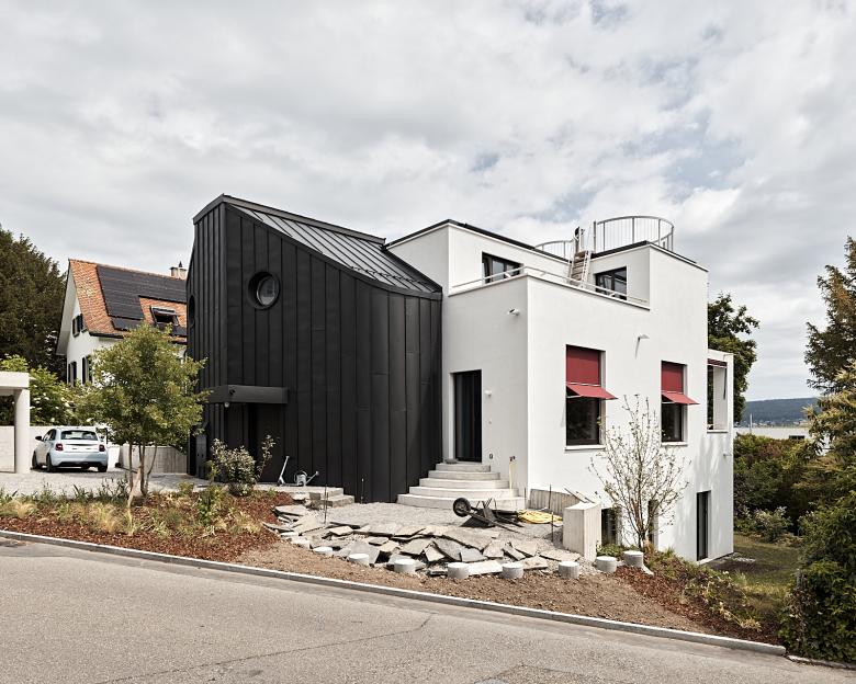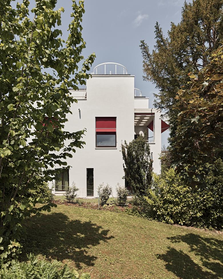 Das Wohnhaus an der Alten Landstrasse in Rüschlikon ist ein Doppelhaus mit zwei sehr unterschiedlichen Hälften, die je über eigene Qualitäten verfügen. Das rechte Haus ist kompakt und hat seine Wohnräume im Erd- und Dachgeschoss. Die Ausrichtung zum See und die Berge erfolgt über die Südseite und das Zimmer auf dem Dach genießt Abendsonne von Westen. Das linke Haus ist maximal weitläufig. Das Wohnen befindet sich auf Gartenniveau, von wo aus allseitig Zutritt in den Garten besteht. Nach Osten eröffnet sich die Sicht auf den See. Die Schlafräume liegen im Dachgeschoss und sind zum See sowie nach Westen ausgerichtet. Verbunden werden die weit auseinander liegenden Räume über ein ovales Treppenhaus und einen Lift. Alle Zimmer im Dachgeschoss haben Zugang zu einer Dachterrasse mit Fernsicht. Beiden Häusern gemeinsam ist eine Wohnhalle mit großen Fenstern und einer Raumhöhe von 3.25 Metern.