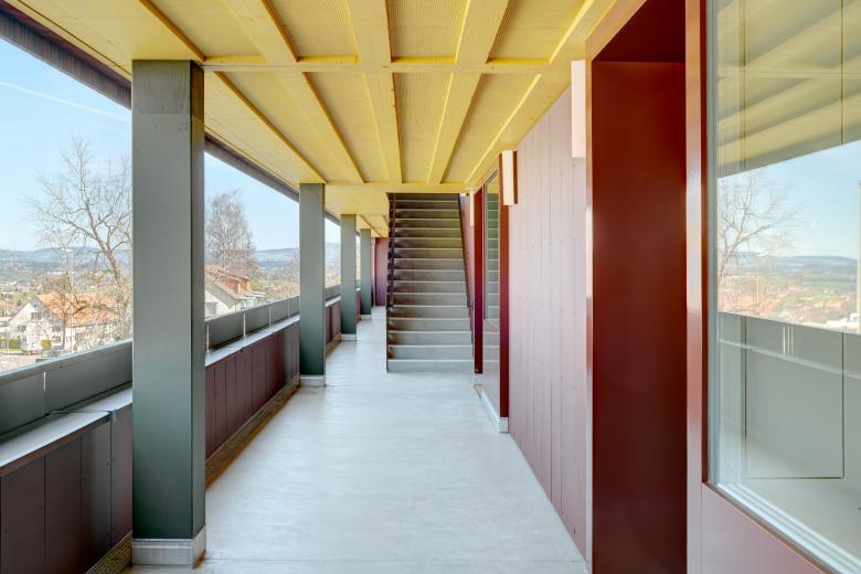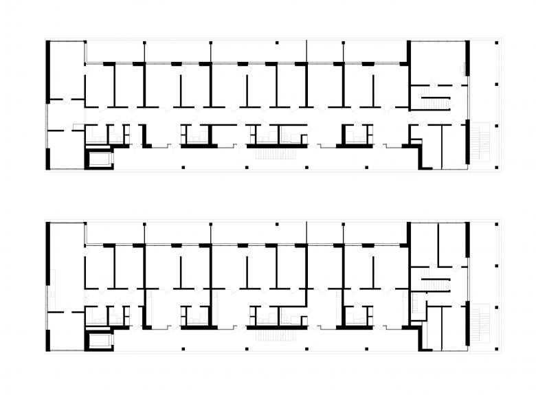 Die Grundrissstruktur entstand ausgehend von dem Wunsch des Bauherrn, das Wohnhaus in den ersten Jahren als Provisorium für zwei psychiatrische Stationen zu nutzen. Es wurde daher eine nutzungsneutrale Kammerung gewählt, die ideal für Klinikstationen ist und zu einem späteren Zeitpunkt mit nur wenigen Eingriffen zu Wohnungen umgebaut werden kann. Der Wohnungstyp orientiert sich dabei an dem bäuerlichen Wohnen: Über die Laube tritt man direkt in eine grosse Wohnküche, über die alle weiteren Räume erschlossen werden.