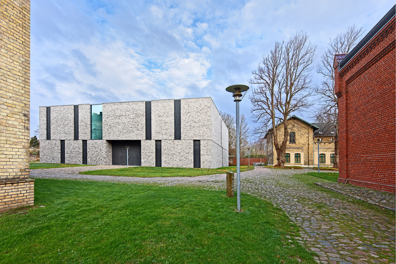 Der Neubau des Magazingebäudes im Bereich des Zentralmagazins auf dem Hesterberg in Schleswig ergänzt die unter Denkmalschutz stehenden Bestandsgebäude. Durch die Positionierung neben dem Verwaltungs- und Bibliotheksgebäude ist ein städtebaulich wirkender Platz entstanden. Dabei bildet ein gräulicher Ziegelstein die äußere Schale, welche sich weder an die gelblich/ockernen noch an den rötlichen Ziegelstein der Bestandsgebäude annähert, sondern den Neubau als eigenen, modernen Baustein in das Ensemble der Ziegelbauten integriert.