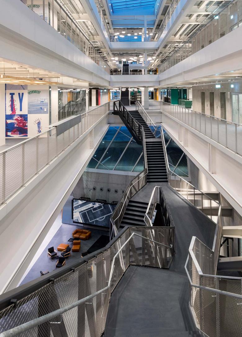 The heart of the ARENA building is the dramatic floating staircase in the atrium. Rising through the bright and spacious light well, it takes employees up to the three-story workspace section and offers exciting views into the atrium, across the open-air level out over the campus, and up to the office floors. A central “main street” links these three levels both vertically and horizontally to create a space akin to a lively marketplace suspended in mid-air. On each floor, the “main street” is adjoined by six kitchen hubs representing six “key cities” characterized by distinctive materials, colors, and types of furnishing to form individual addresses within the building. Work areas alternate with areas for formal and informal meetings and recreational zones. They are organized as variegated clusters around light wells of different sizes optimized to supply ample natural light.