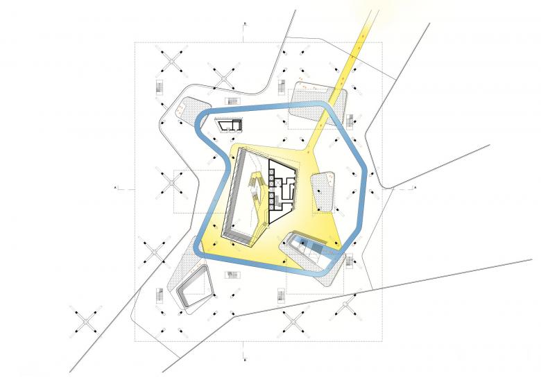 The architectural idea behind the ARENA building is predicated on a finely balanced interplay between transparency, landscape, and a modern concept of work based on communication and interaction across professional fields as well as responsiveness to future developments. The result is a striking landmark formed by an abstract volume housing three workspace floors that hovers above a modeled landscape. This sculpted hill accommodates the building’s entrance area, part of which is publicly accessible, leading to a vast bright atrium suitable for a variety of events.