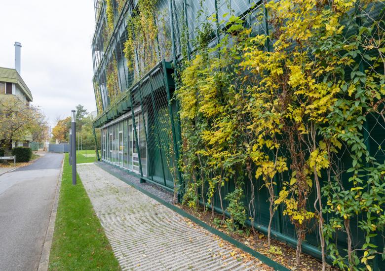 The closed facades feature a shelf construction with vertical greening in which the linear planters form a horizontal grid at the level of the floor slabs. Story-high climbing supports in the planters help train evergreen climbing plants that were selected for suitability to the growing conditions on the different sides of the building. The facade terminates in a projecting trellis at the top of the building.
